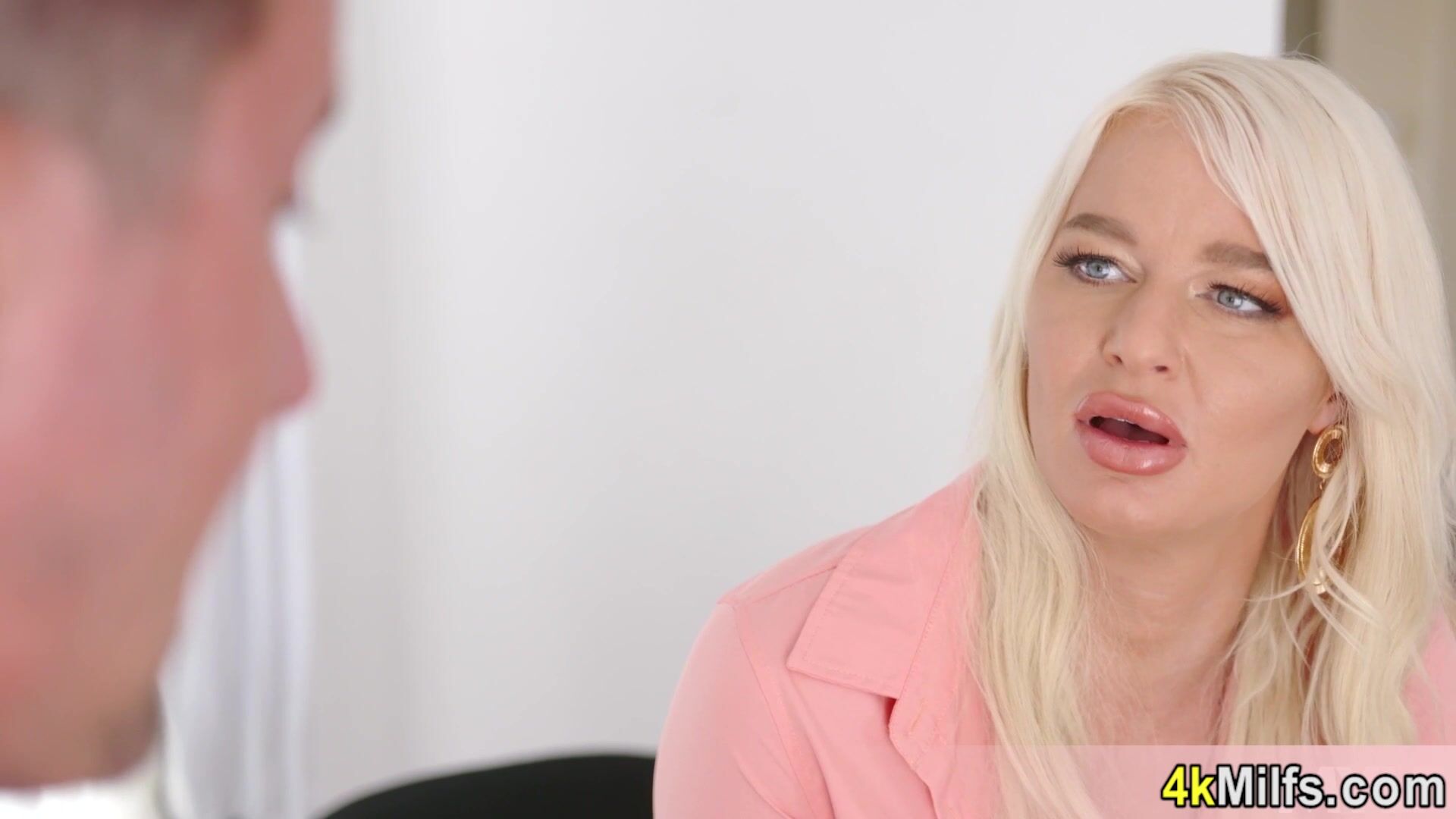 Blonde mature boss London River with big natural tits ordering her shy intern to satisfy her powerful pussy She is sucking his big cock then orders him to fuck her hungry cunt hard