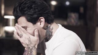 Stepbrother catches stepdad and stepsister fucking and the small tits babe asks to have a 3some.The brunette deepthroats their big dicks and the older man facefucks stepdaughter.He bangs her rough as he masturbates her hairy pussy and she gives a bj