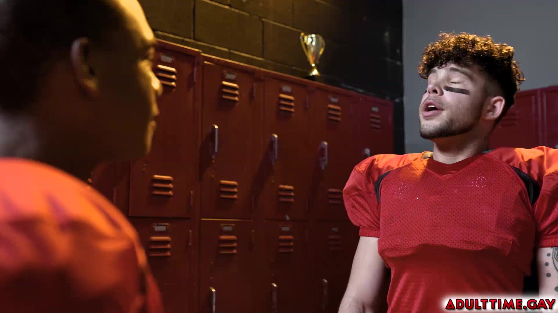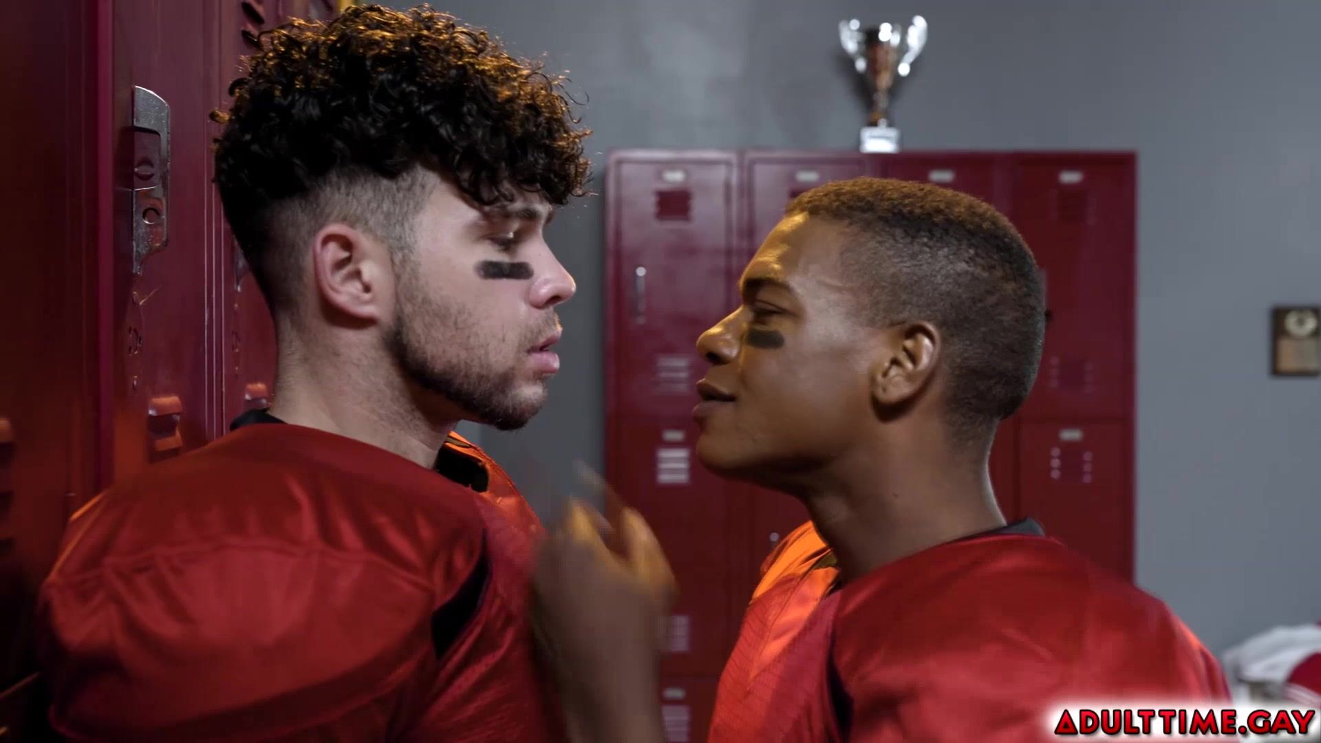 Football players Adrian Hart and Joseph Castillan get into a heated argument in the team's locker room. As they both try to calm down their eyes lock and engage in a fiery kiss that leads them to have hot anal sex.