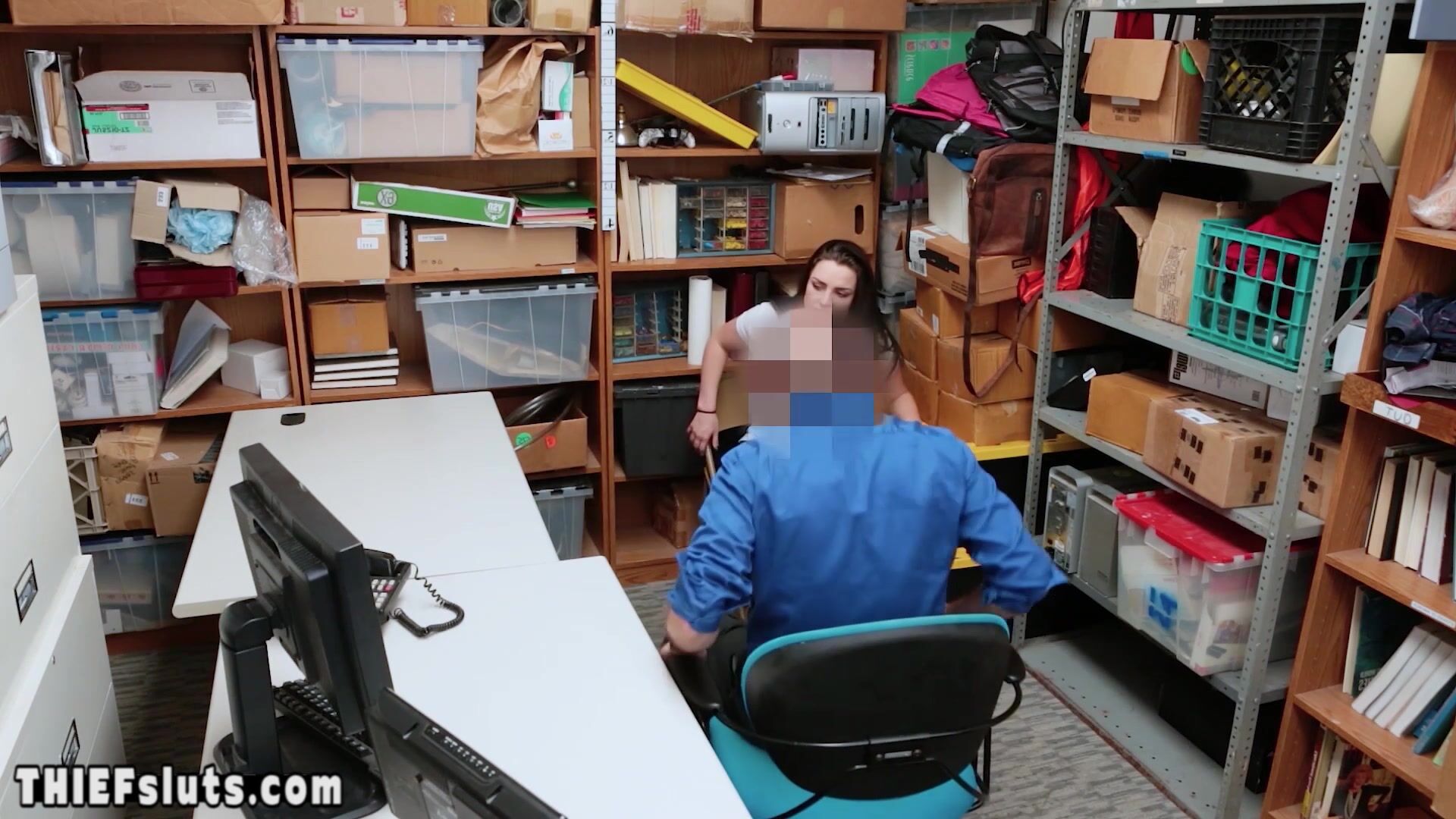 LP officer brings a hot brunette teen thief Raven Reign with perfect natural tits to his office and after the interrogation he orders her to suck his throbbing cock then he is fucking her shaved pussy roughly