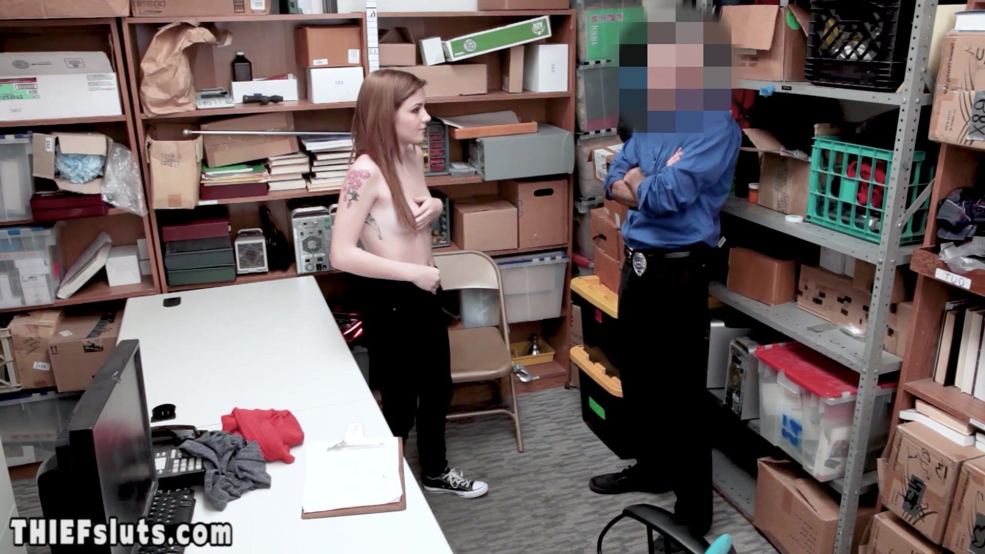 Petite scared brunette teen thief Rosalyn Sphinx with small tits takes off her clothes and a perv LP officer is fucking her pretty face and her shaved pussy to teach her the rules