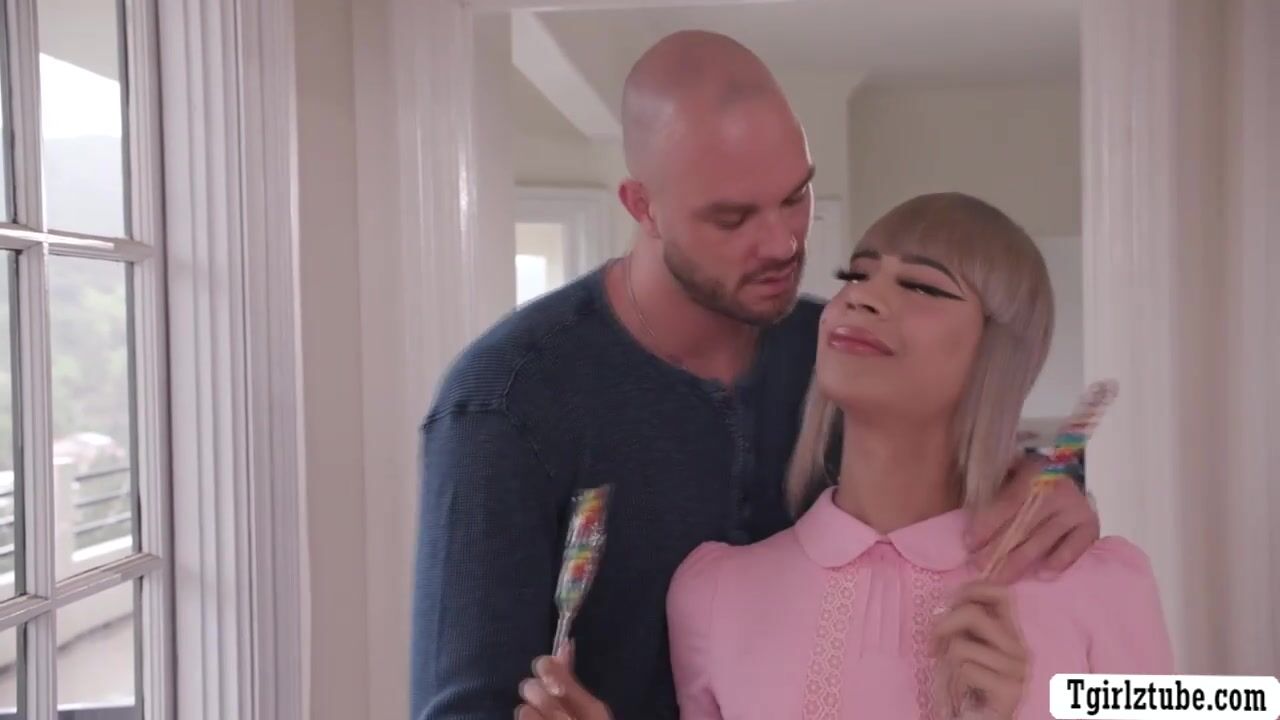 Blonde TS babysitter Itzel Saenz is eating candies and her boss caught her.Instead of getting mad,he lets her throat his hard big cock passionately and in return,he bareback fucks her tight asshole so deep and fucking hard.