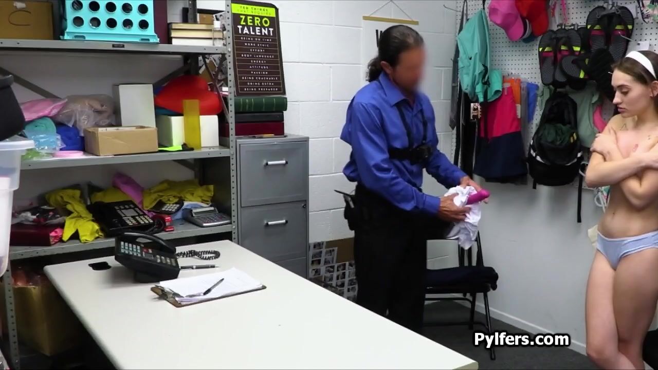 She tried to steal a big ass pink dildo in her panties, but obviously she got busted by the security guard. Now she can try it out for real!
