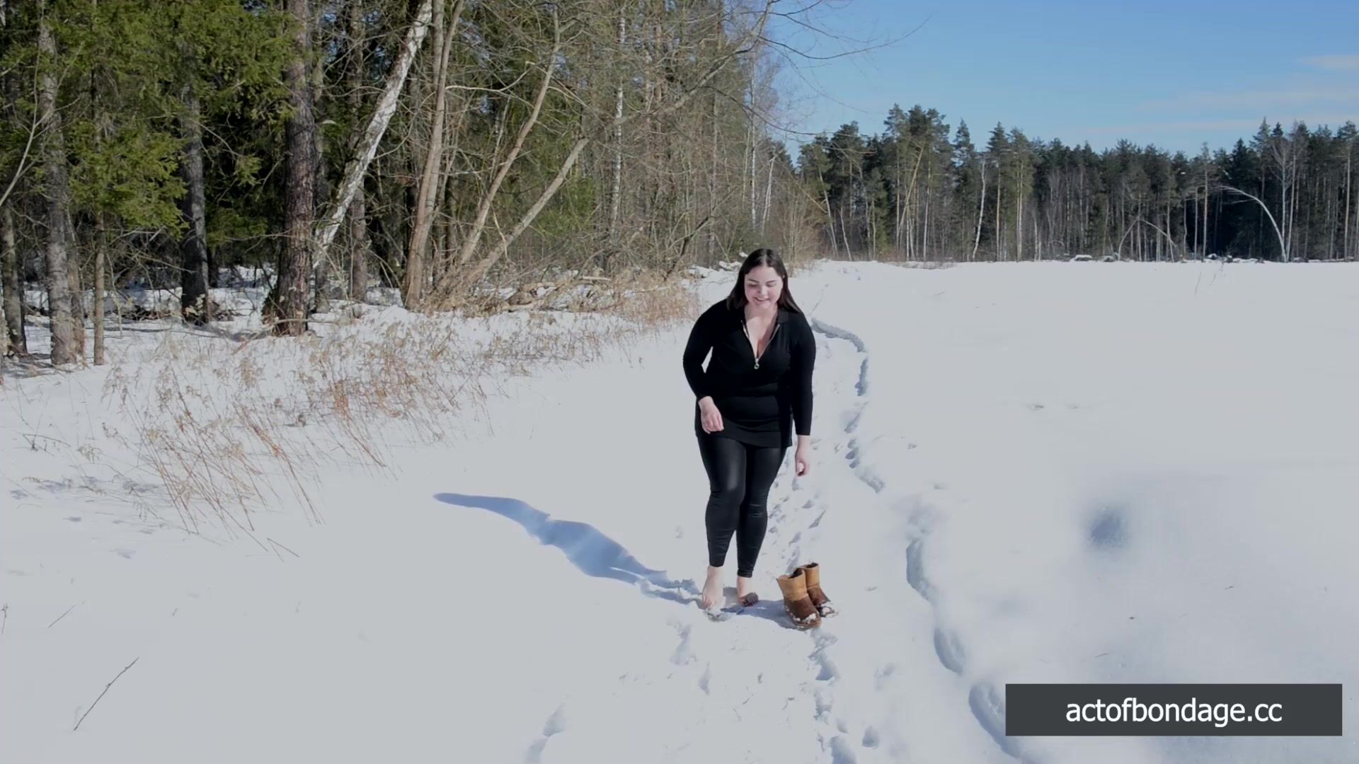 Fat Natasha, naked and barefoot, is tightly bound and helpless in the cold snow on a chilly winter day. Her soft curves pressed against the icy ground sends shivers down her spine, but the cold weather isn't what sends a blush to her cheeks.