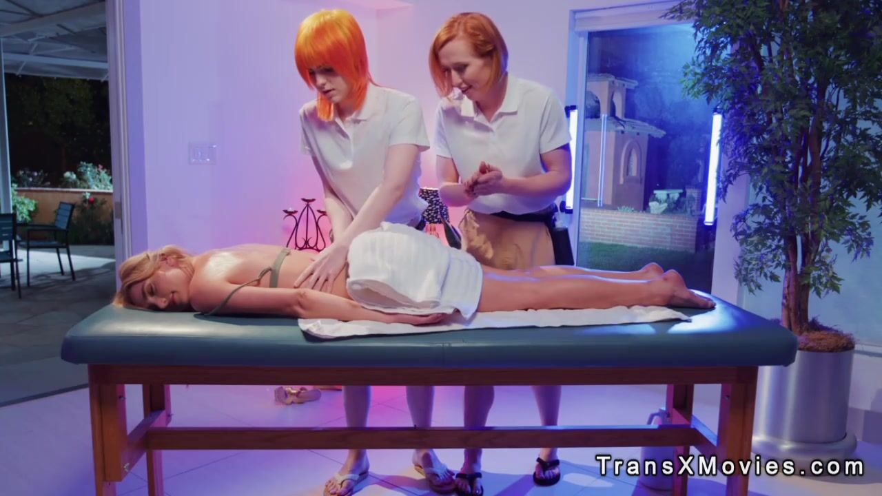 Shemales fuck blonde in massage parlor in threesome