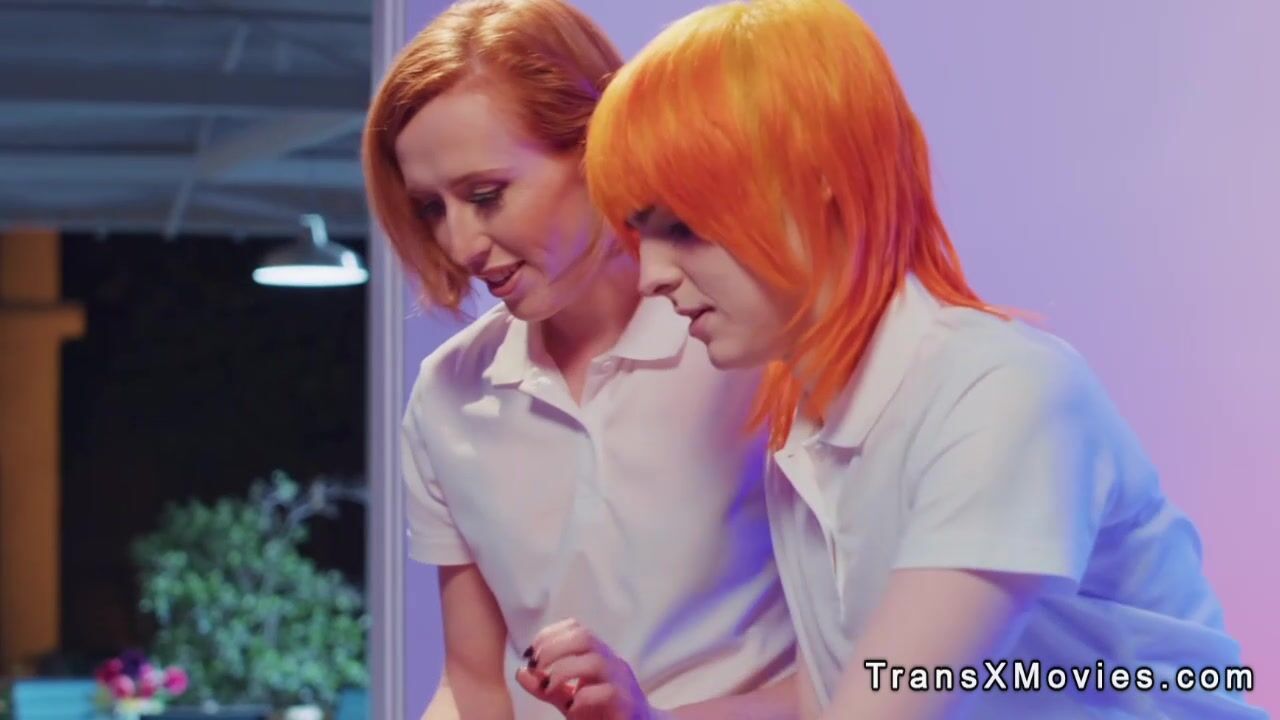 Redhead shemale girlfriends Jean Hollywood and Shiri Allwood giving massage to hot naked blonde babe Kenzie Anne then fucking her in mouth and pussy in threesome