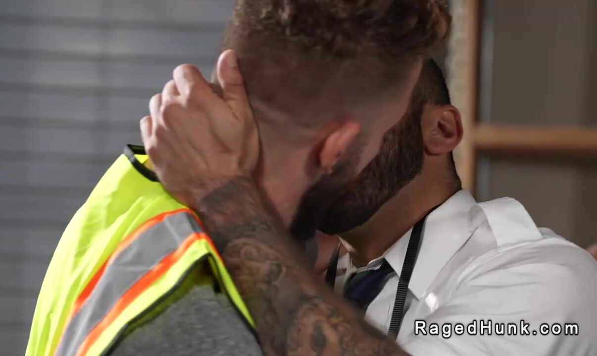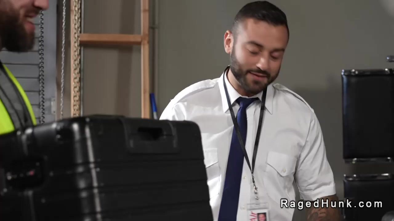 Baggage handler Morgxn Thicke is overloaded with suitcases when flight attendant Drew Valentino gets and sucks his dick then anal fucks him in furry ass hole