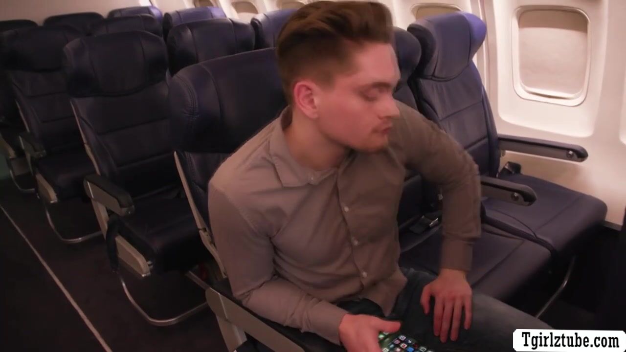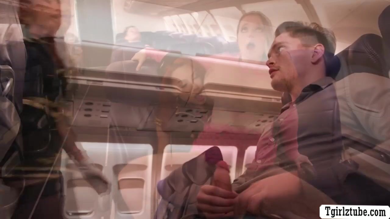 Slut TS flight attendant threesome with her passengers in plane