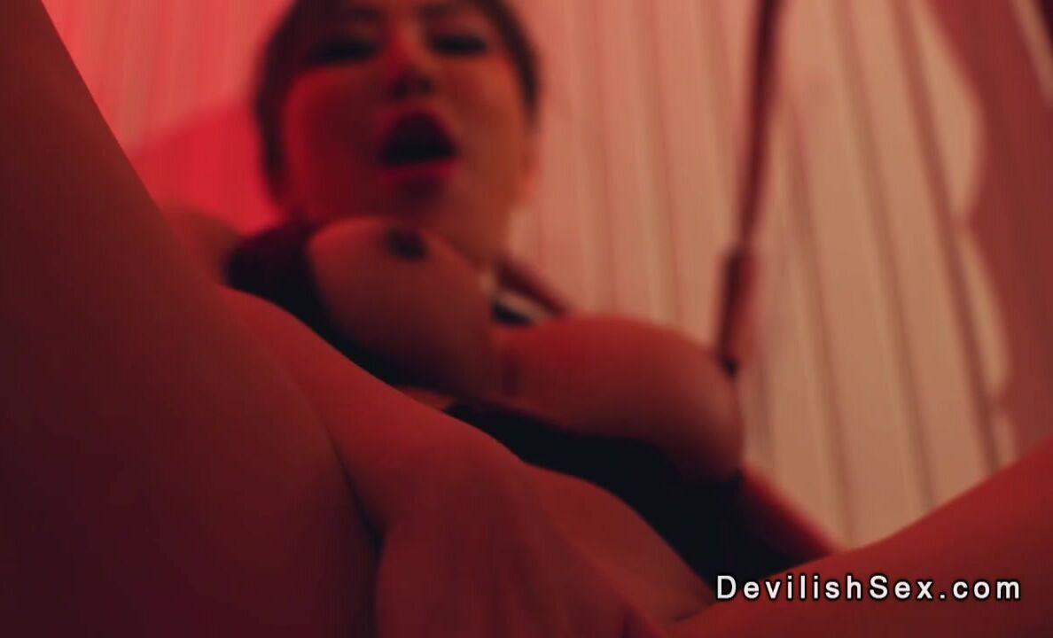Big tits brunette Asian Goddes Nuwa as Nicole Doshi masturbates with fingers then big dick Seth Gamble rough fucks her shaved pussy in doggy style and other positions