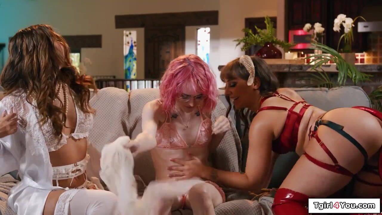 Devil and angel fight over small tits trans Claire Tenebrarum and share her in 3some.The petite babe deepthroats her small tranny cock and the tgirl is rimmed as she fucks her.The devil fucks the brunette with strap on toy and gives the ts a footjob