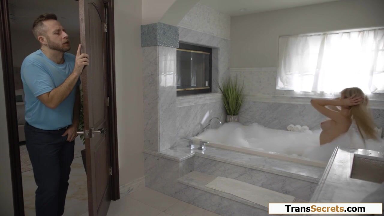 Im fucking hard watching busty shemale Tori Easton get naked and getting in the tub.I secretly get into the tub and the tgirl cant resist my hard dick.I kiss the big tits blonde trans and lets her deepthroat my cock.I anal bareback the hot tranny