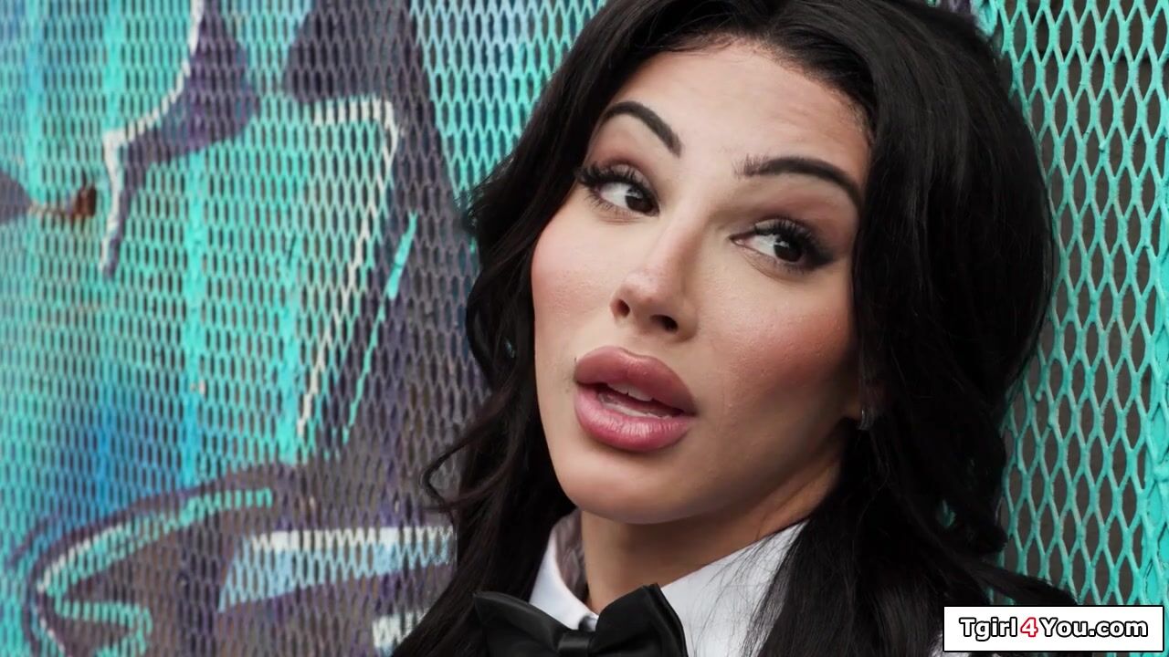Coworker asks trans waiter Ariel Demure to go for a quickie during their break.They kiss and the big tits tgirl deepthroats his big cock.He rims the ts and sucks her tranny dick as he plays with her butthole.The busty brunette shemale barebacks him