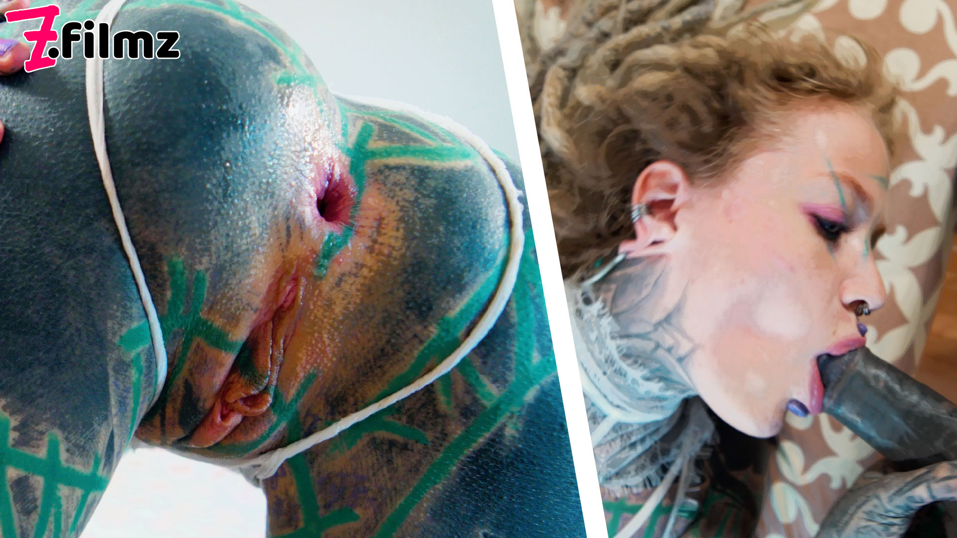 Tattooed Anuskatzz in sexy lingerie shows herself off before she sucks Lily Lu's dick, making it all wet and slippery, ready to fuck her ANAL!