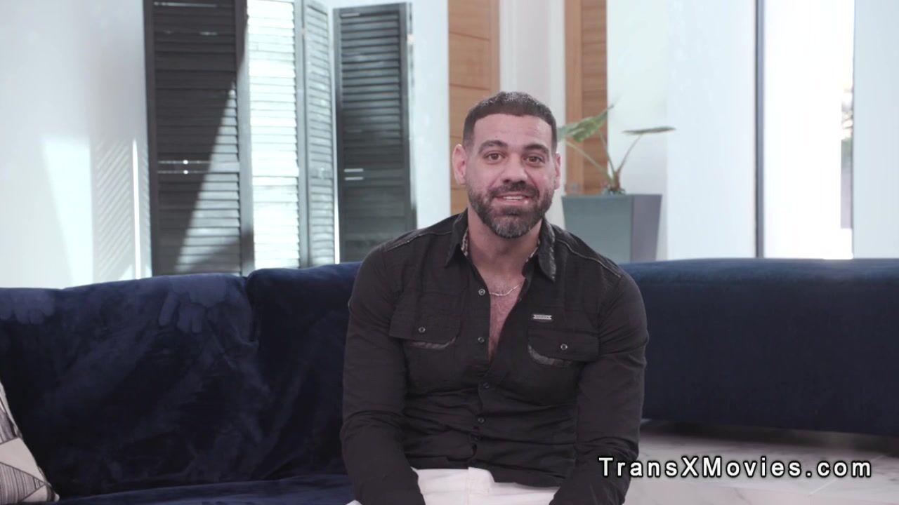 Hot brunette trans Kasey Kei in thin orange lingerie and stockings seduces Ricky Larkin and gives him footjob while he sucking her dick then gets anal fucked in the living room