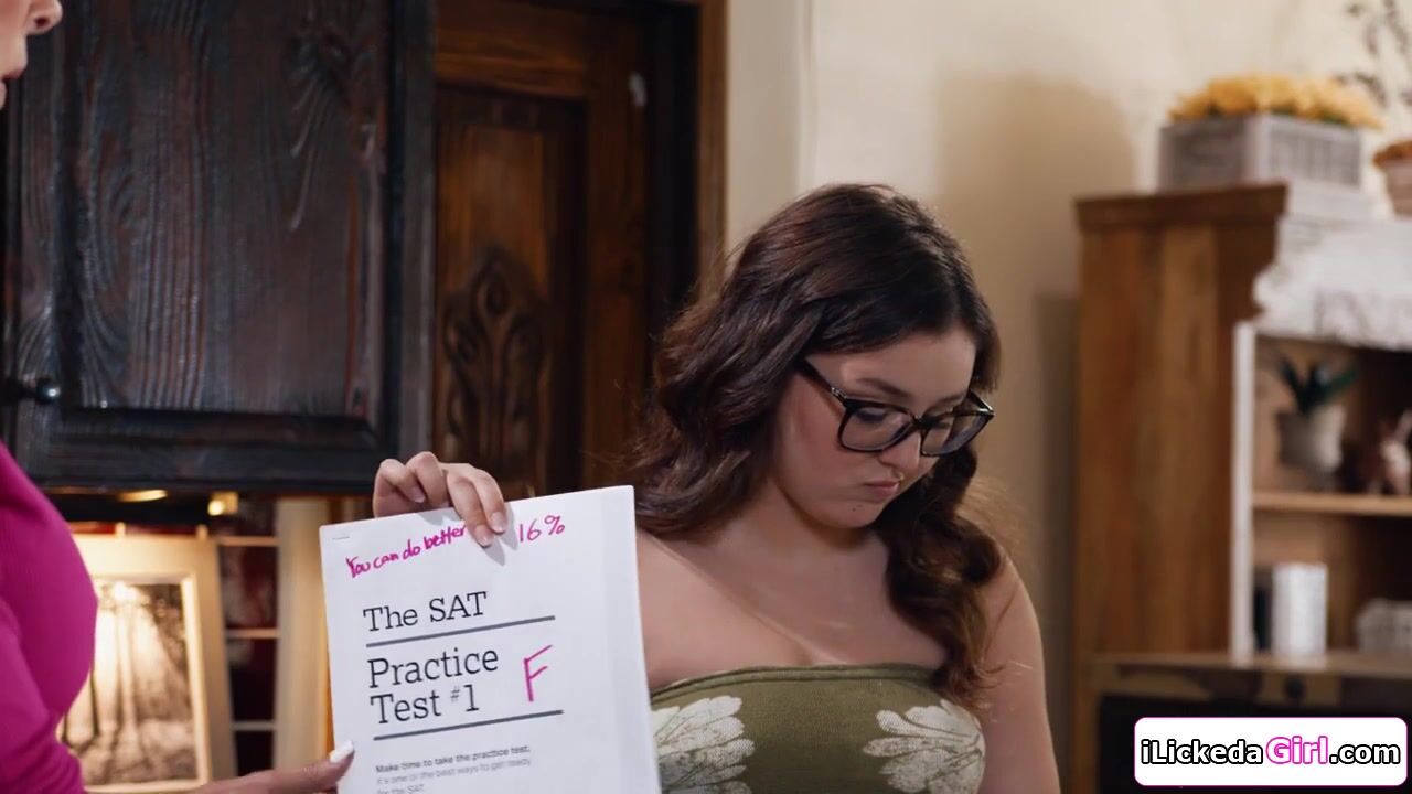 Brunette milf is spanking her stepdaughter while checking her exam papers.After learning a thing or two,she rewards the teen and starts kissing her.The petite babe is licking and facesitting her big tits stepmom before they do scissoring on the sofa