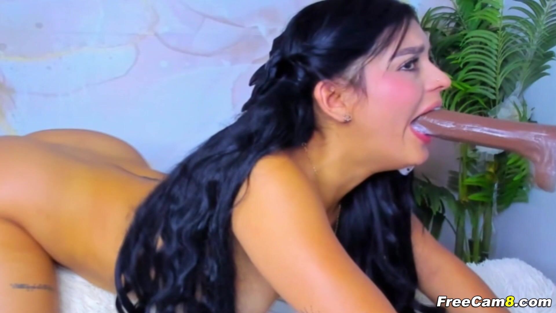 Dark hair cascading down her back, framing her flushes face as she eagerly sucks dildo machine in front of her. Her beauty moans as she eagerly slid the slick, saliva coated dildo into her mouth. She gazes up at the camera with a sultry look, her lips glistening with saliva as she sensually sucks on the dildo. Her full, glossy lips wrapping tightly around the thick, glistening dildo. Her dark curls bounces as she enthusiastically sucks this dildo, her tongue swirling around the tip with each eager thrust.