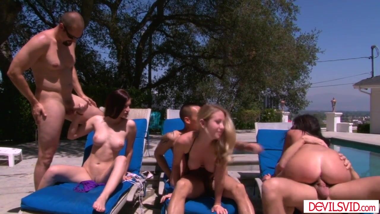 Cassandra Nix and her friends Mira B and Mandy Armani are chilling when suddenly their boyfriends come in caressing them.They swap partners and start the group sex party exchanging partners.She bends over as two guys are double penetrating her.