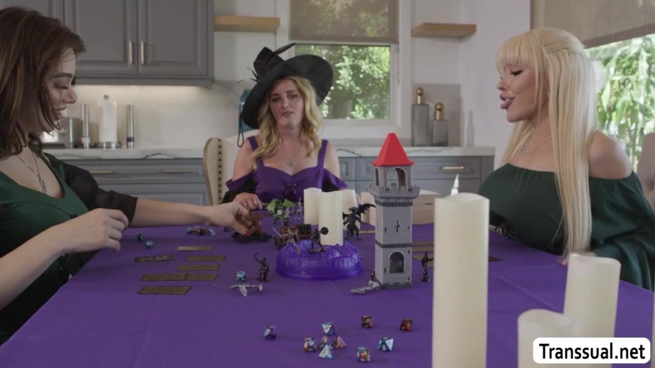 Slut Coco Lovelock hide under the table while two TS Brittney Kade and Emma Rose are playing.She throats their hard shecock passionately and after that,they lick and fuck her wet pussy so deep and fucking hard.