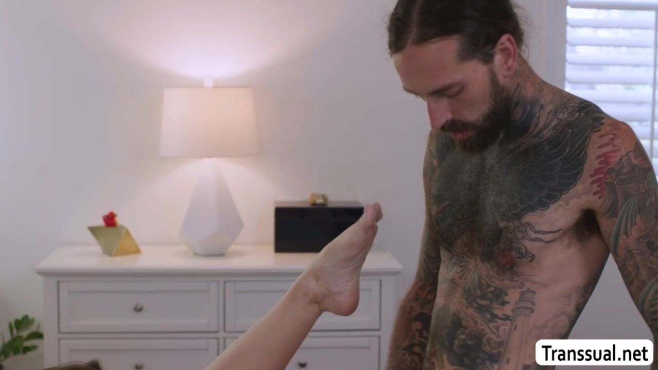 Beautiful TS Asia Belle and her husband Ruckus are on the bed kissing each other.After that,Ruckus sucks her nipples and in return,Asia throats Ruckus big cock passionately.Next is,Ruckus bareback fucks Asias tight wet ass so deep and hard.
