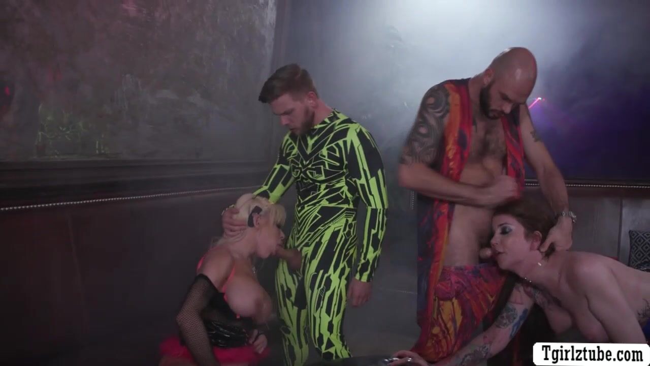Two busty shemales Gracie Jane and Brittney Kade are so wild in the club.After that,they go straight to the room and suck two guys big cock passionately.Next is,they let the guy bareback fuck their wet asses in double penetration.