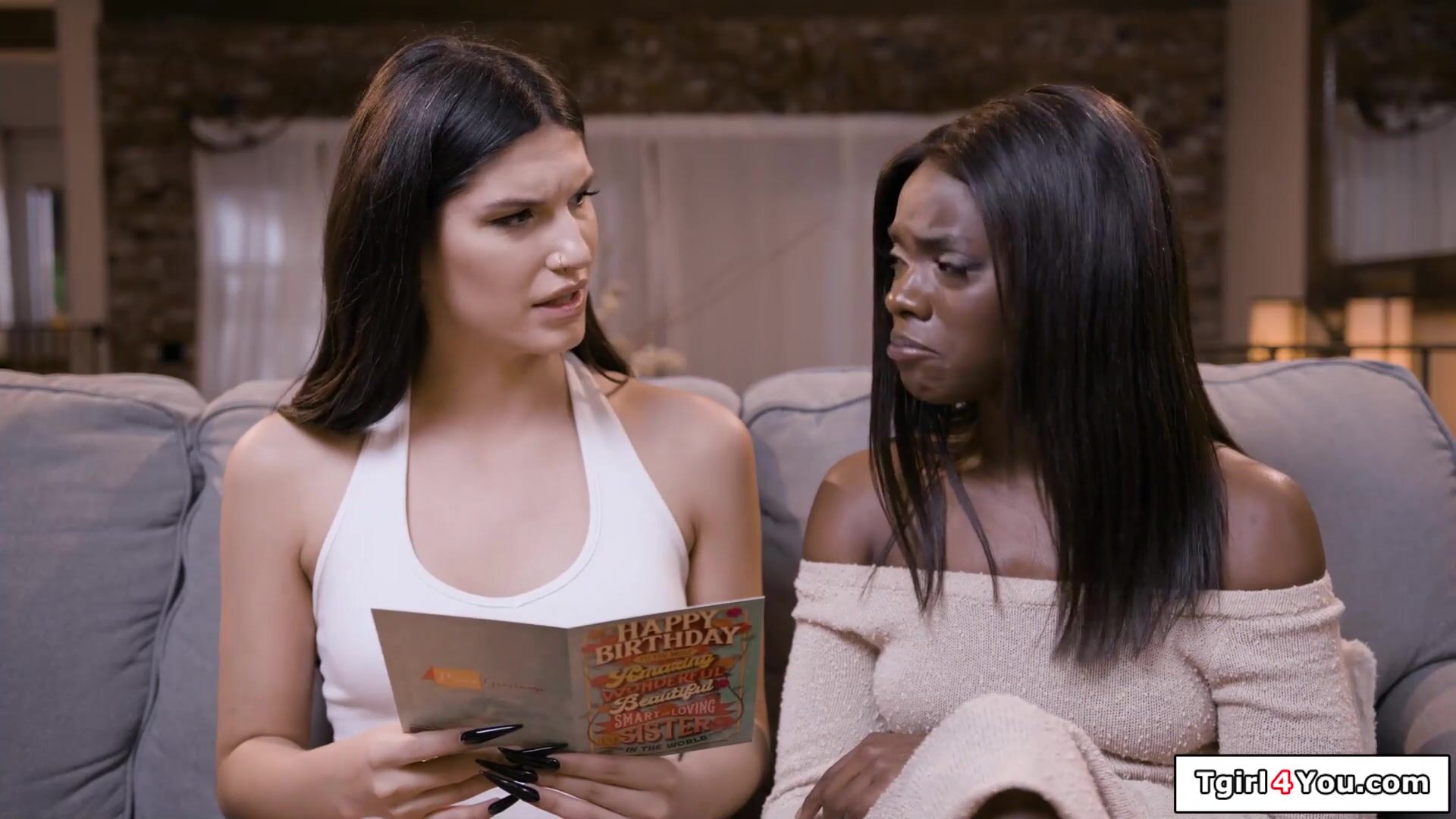 Brunette trans Zariah and her ebony gf Ana Foxxx celebrate good news with sex.The small tits tgirl gets her feet sucked and licks the black babes hairy pussy while jerking of her big tranny dick.Anna deepthroats the shemales cock and gets doggystyled