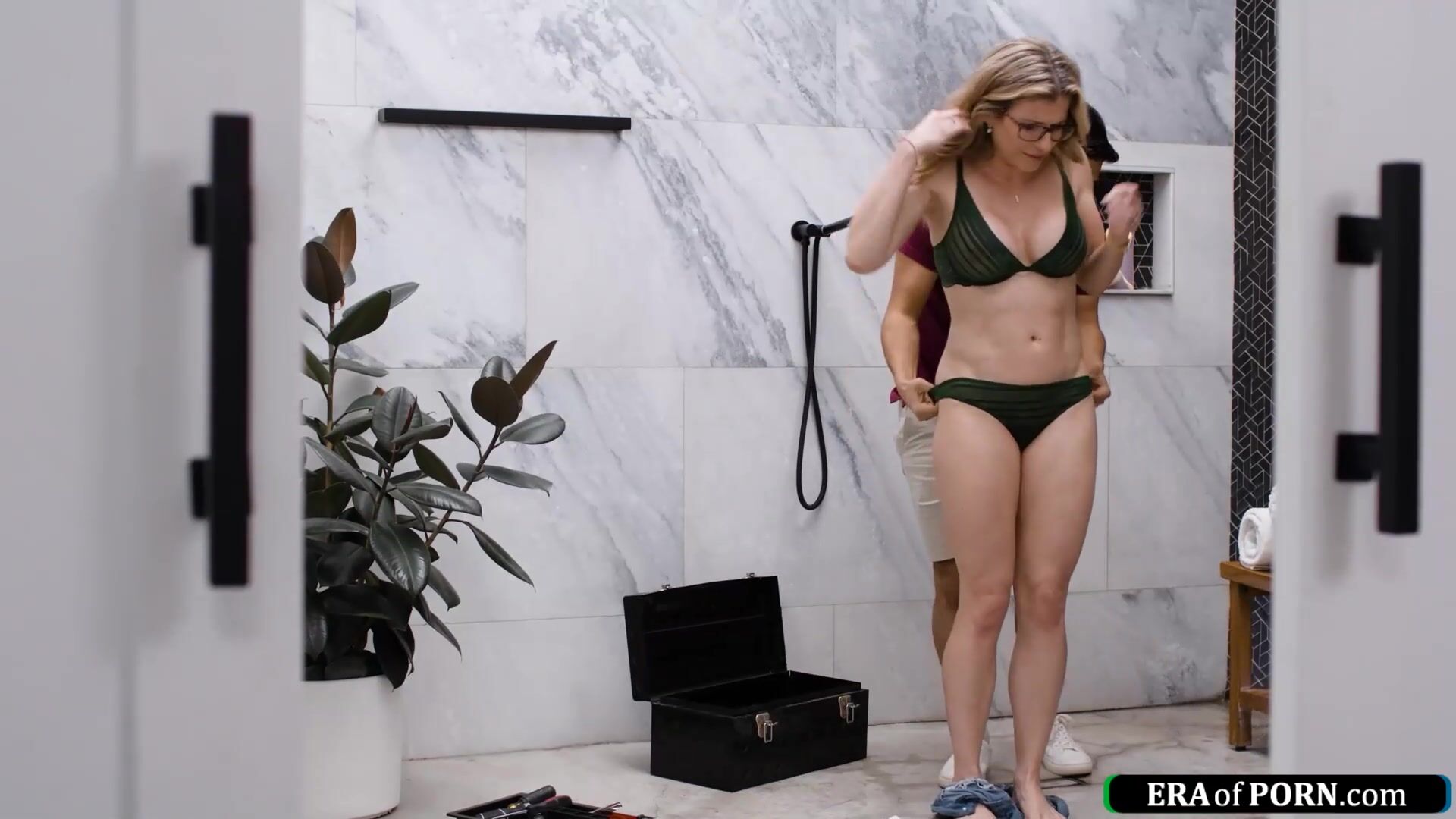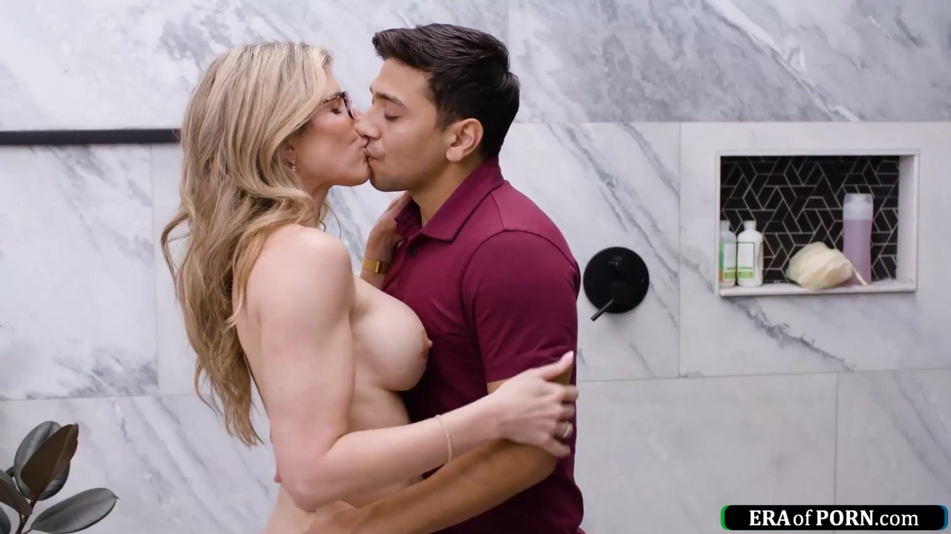 Big tits stepmom Cory Chase is soaking wet and gets undressed by her stepson.The busty milf gives him a kiss and gets her boobs sucked.She has her shaved pussy fingered while licked.The petite blonde cougar swallows his big dick and is doggystyled
