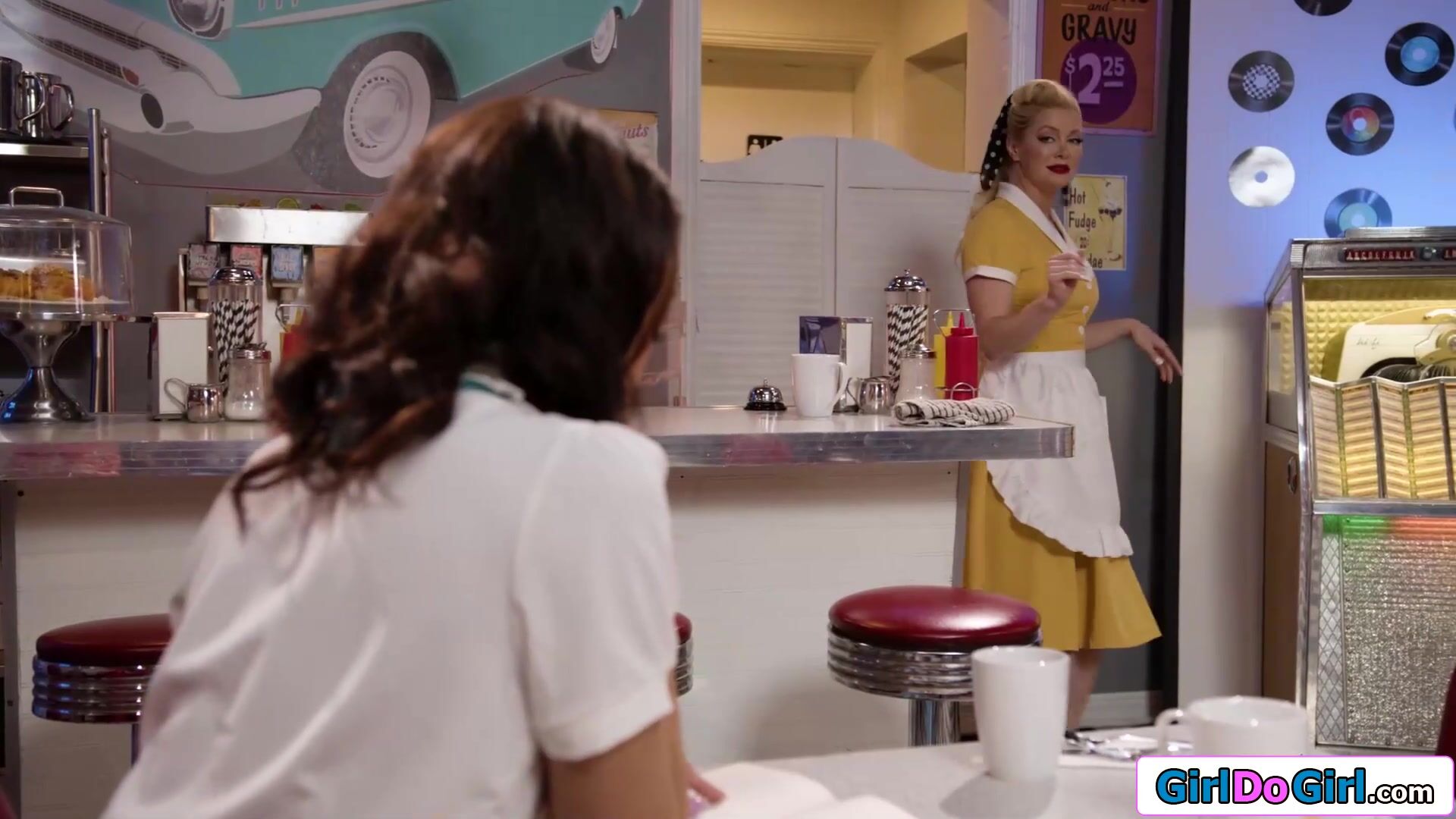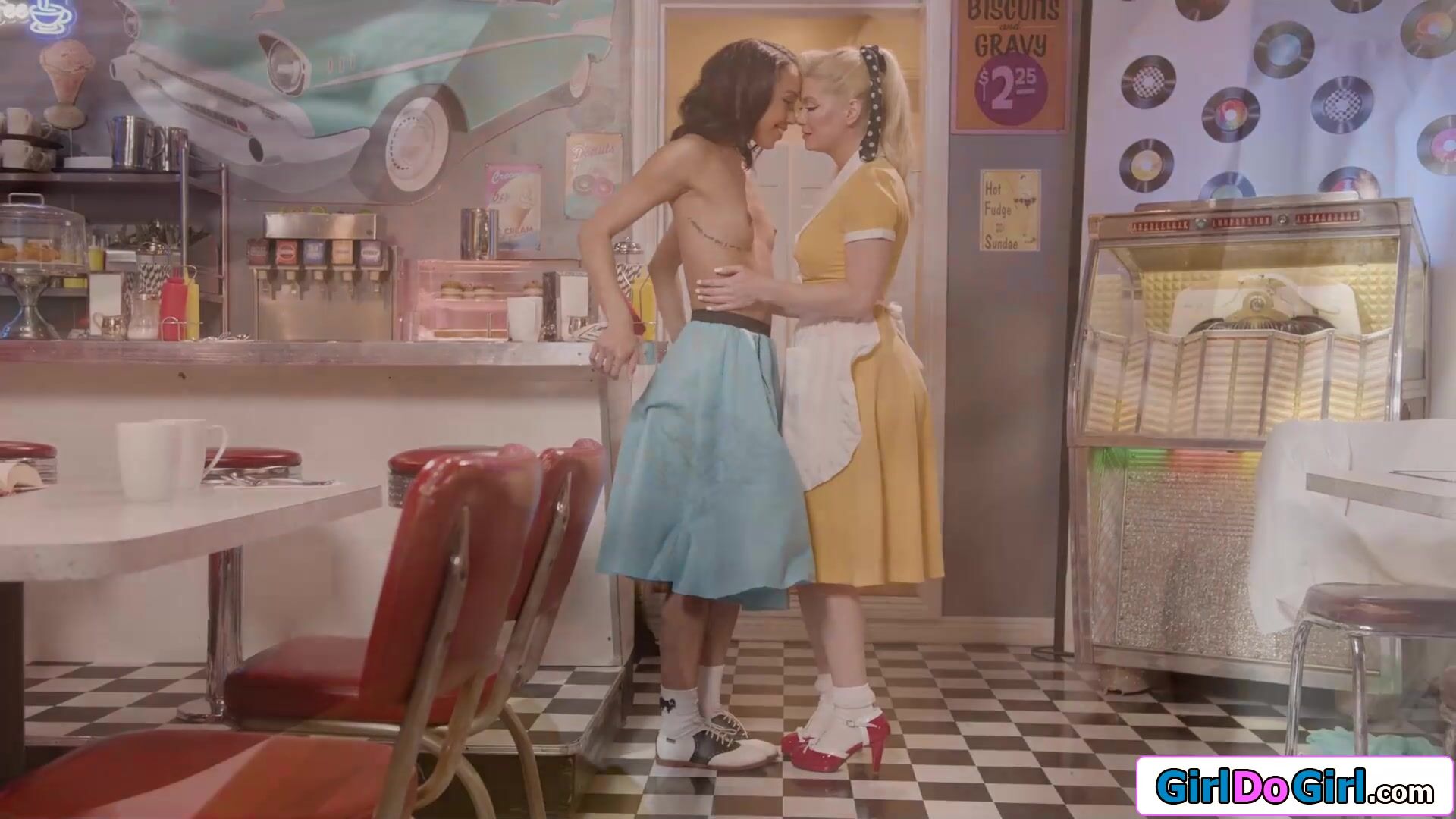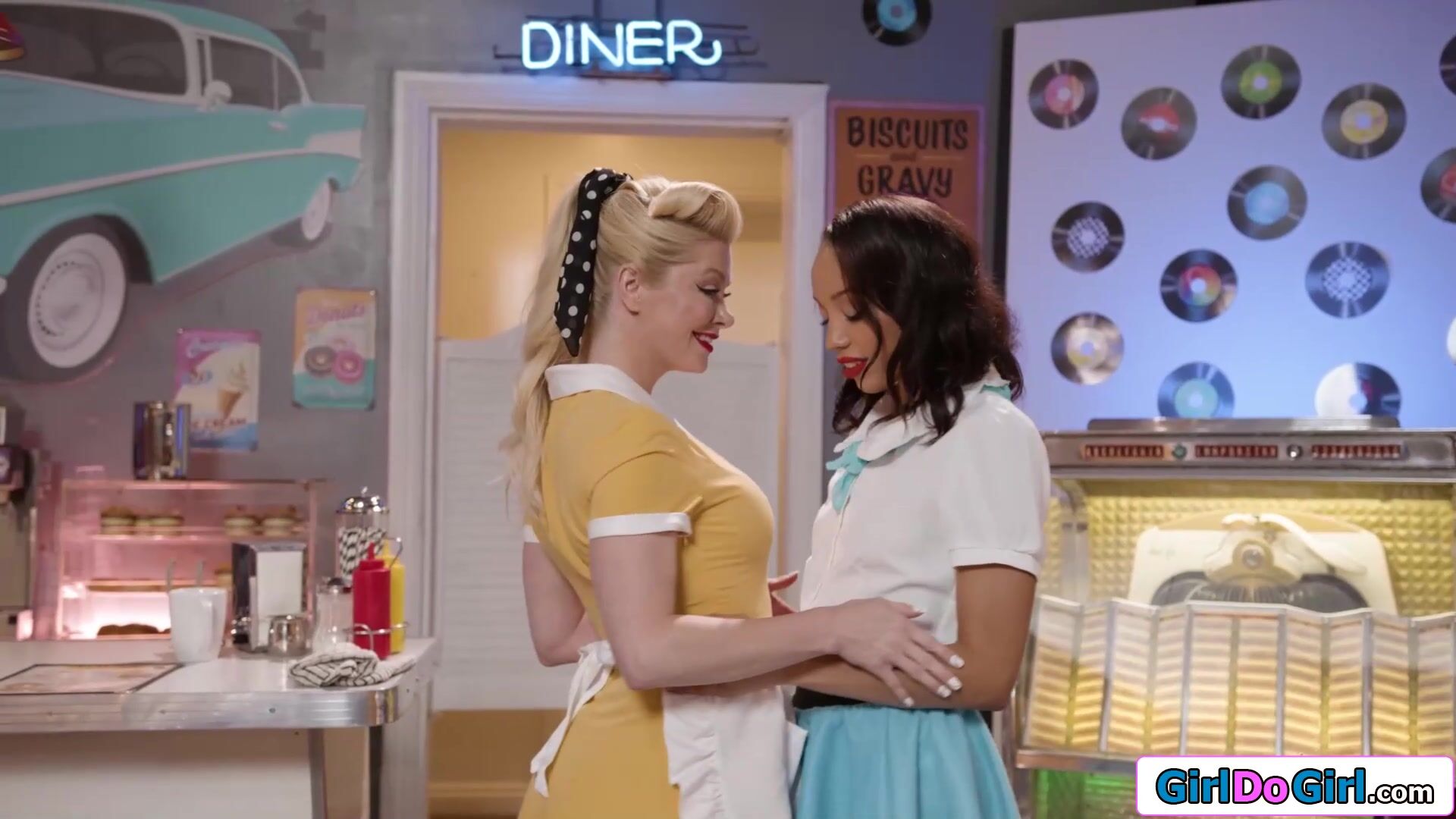 Busty milf waitress Serene Siren has her eye set on her hot ebony customer Alexis Tae.A kiss is all it takes.The big boobs cougar masturbates the small tits black babes pussy and is fingered while getting oral.The blonde licks the brunettes snatch