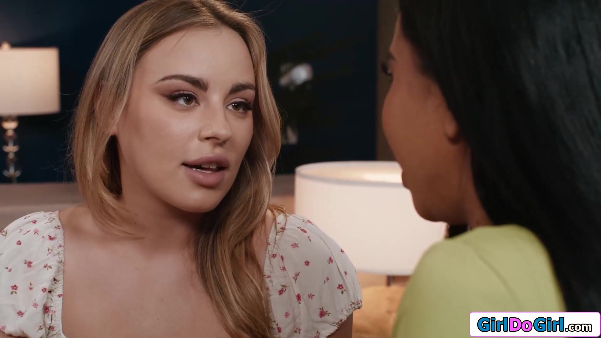 Ebony Ameena Green is quite nervous for her first lesbian experience.Her date Anna Claire Clouds suggests to close her eyes while she kisses and masturbates her.The small tits tattooed blonde licks her pussy and the black babe gives oral and rims