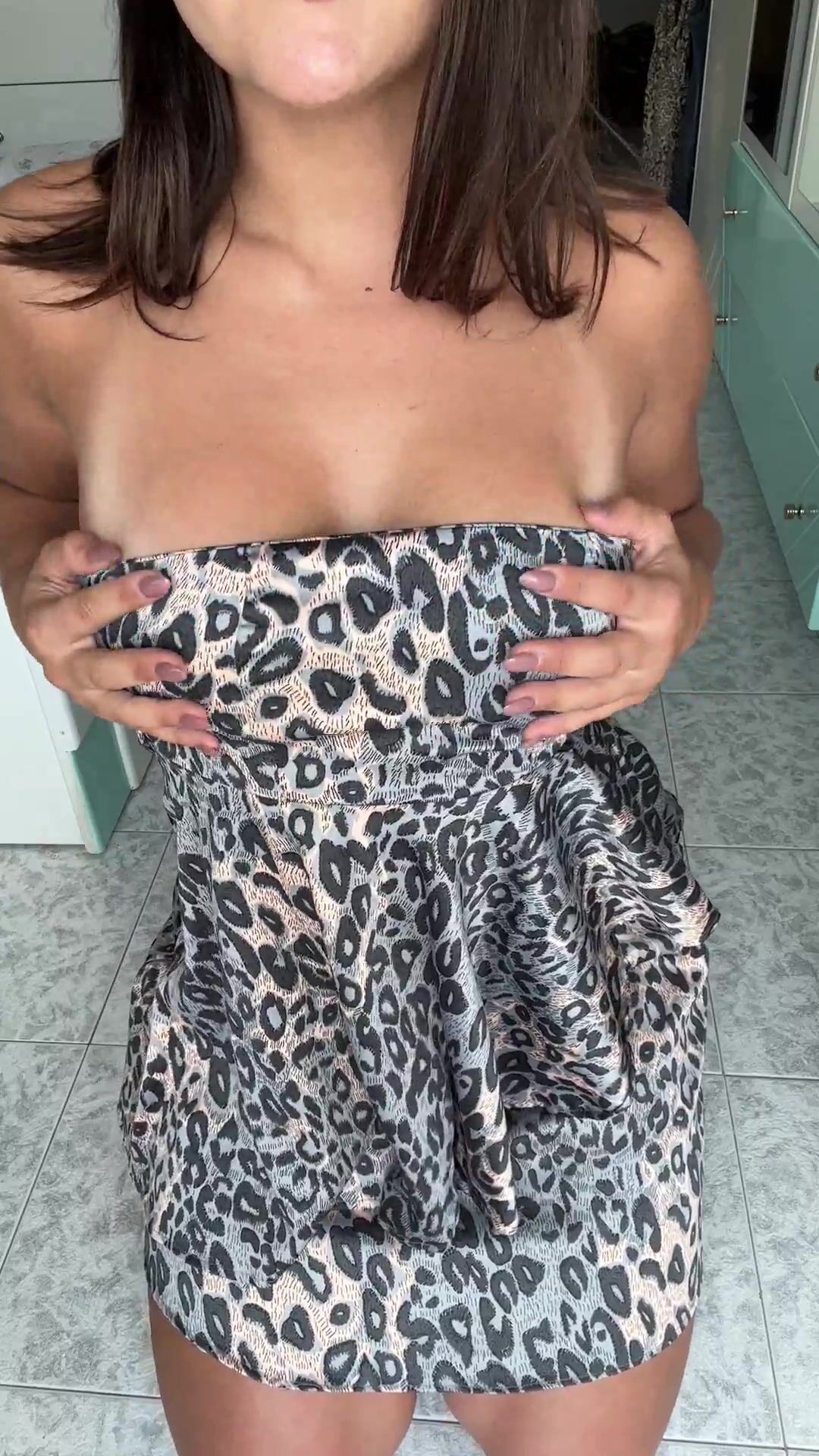 Horny wife squeezing her boobs in leopard dress