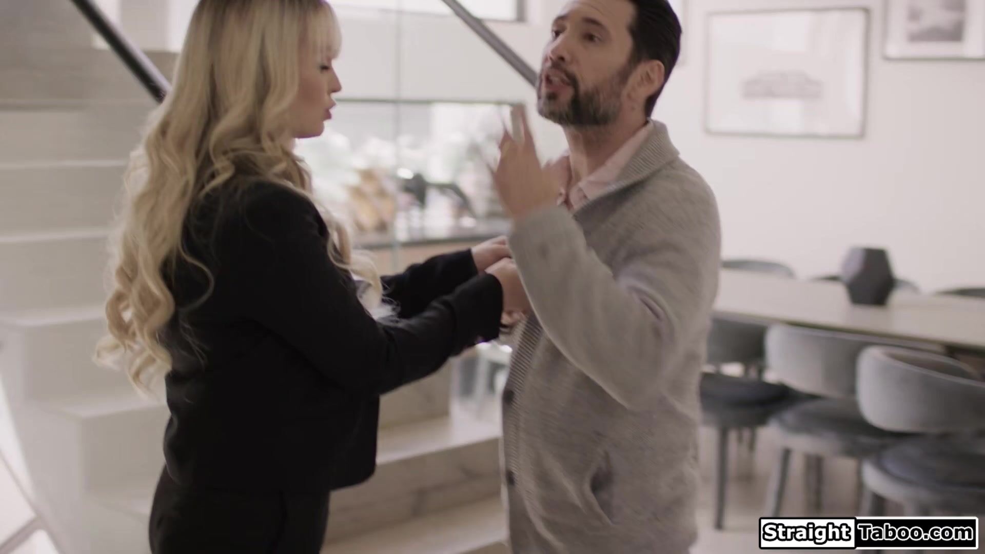 Horny realtor Lilly Bell locks clients wife in so she can suck off his dick.The blonde deepthroats him almost to the end before freeing his wife again.The petite babe is not finished and lets him eat her ass and hairy pussy before getting fucked
