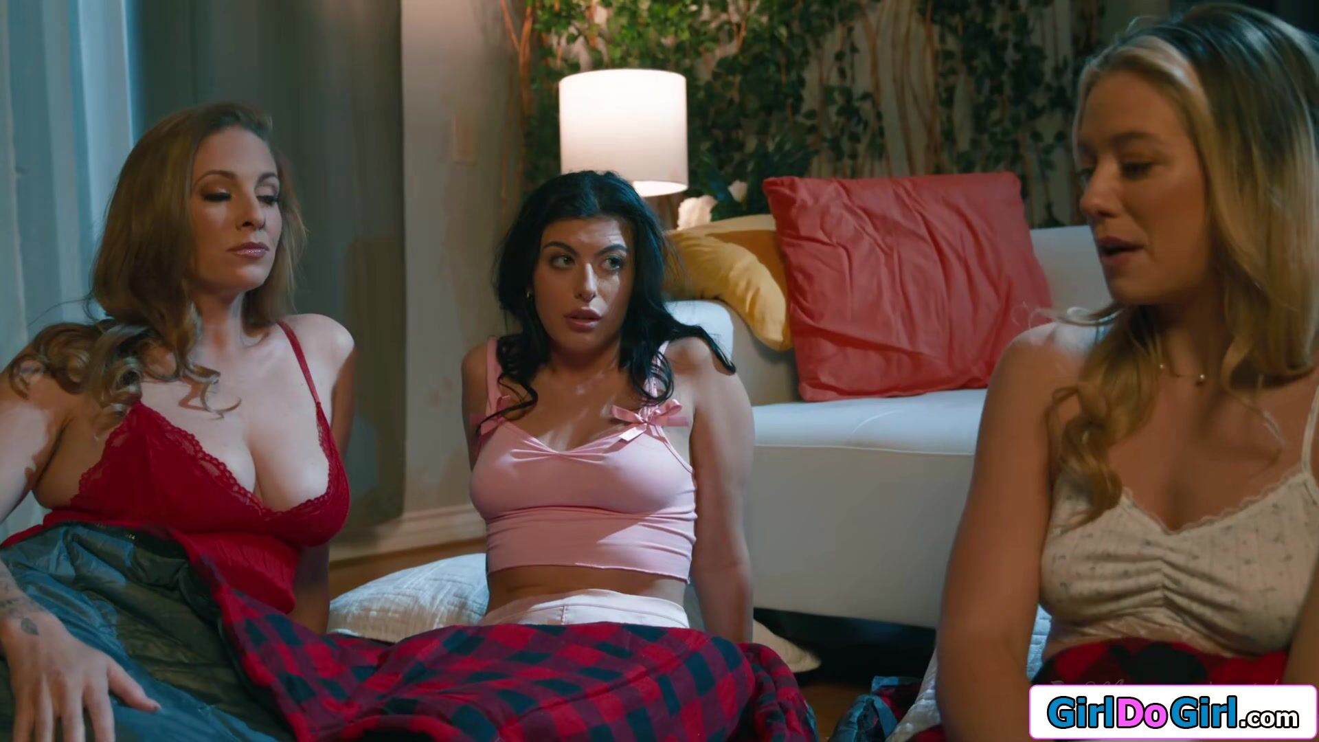 Teen River Lynn wants to join her stepmom Annie King and petite bff Gal Ritchie.The lesbians kiss and the busty milf gets her big tits sucked before shes get oral while licking her stepdaughters pussy.The babes sit next to each other and masturbate