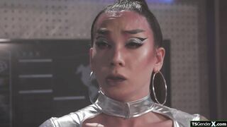After being frozen for 500 years asian trans alien Kasey Kei is horny as fuck.The shemale gives a double handjob and is rimmed.The small tits tranny is deepthroated and sucks the space captains big cock.The brunette tgirl bareback anal rides