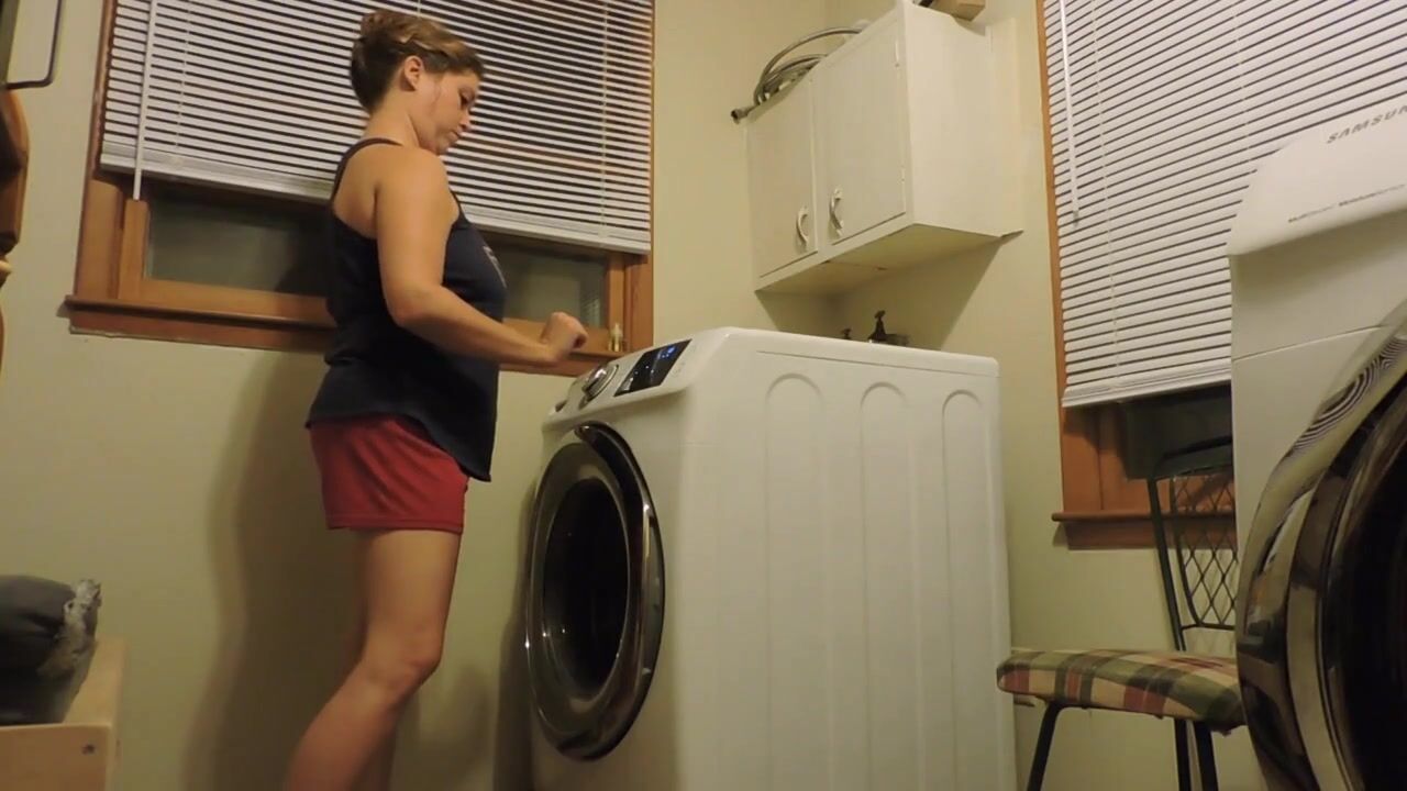 A horny husband surprises his busty brunette wife with a new washer/dryer set, but they can't wait to test it out, and so a hardcore fuck session ensues, leaving the laundry for another day.