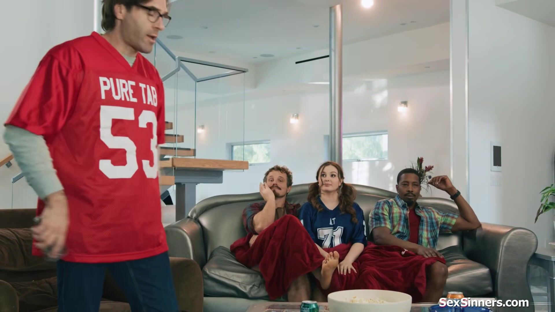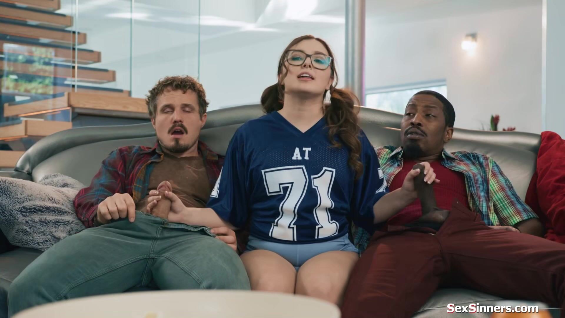 Stepdaughter Leana Lovings sits between her stepdads two friends and starts to jerk them off behind his back.The petite teen sucks them both and rides the guys big black cock.During half time they have a minute to really fuck the horny brunette