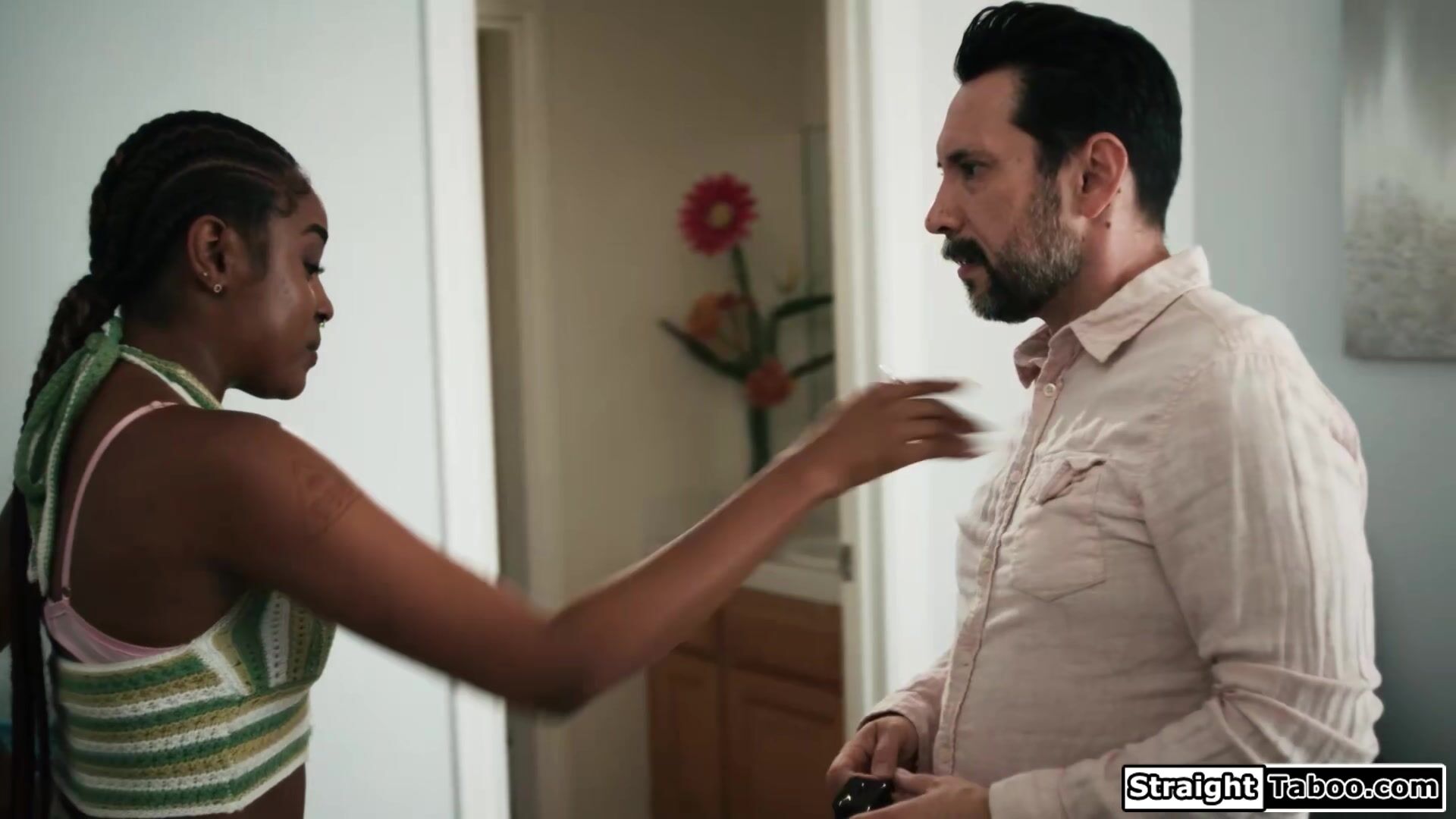 Stepdad is caught spying on his ebony stepdaughter Destiny Mira so she makes him watch her masturbate.The black babe gives her stepdaddy a footjob and gets her shaved pussy licked.The brunette deepthroats his cock and is fucked until she squirts