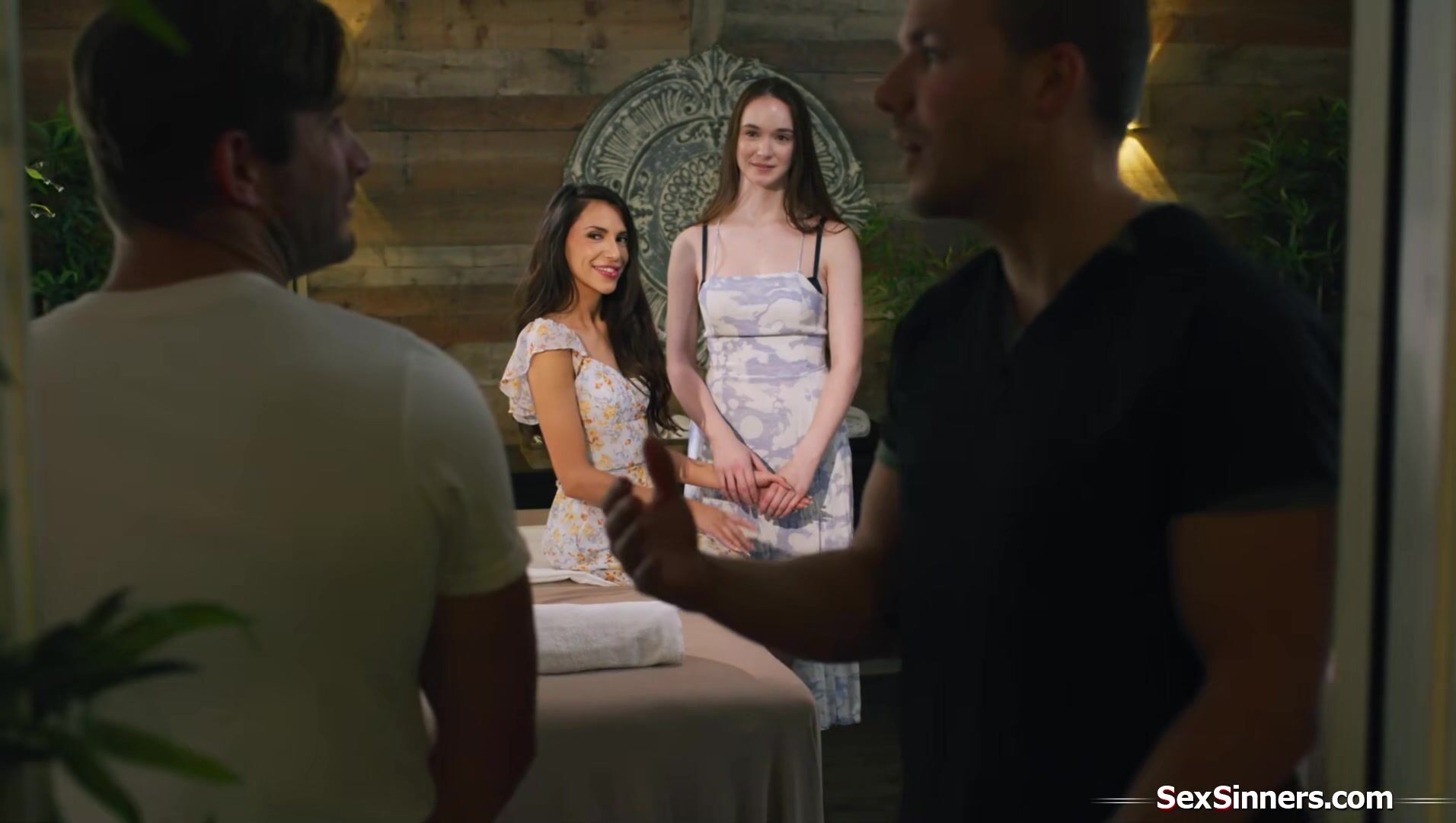 Lesbians Hime Marie and Hazel Moore have a couples massage.The horny masseurs focus on the small tits latina which they know they can fuck in secret next to her wife.While one massages the busty babe the other is sucked.They fuck and anal the brunette