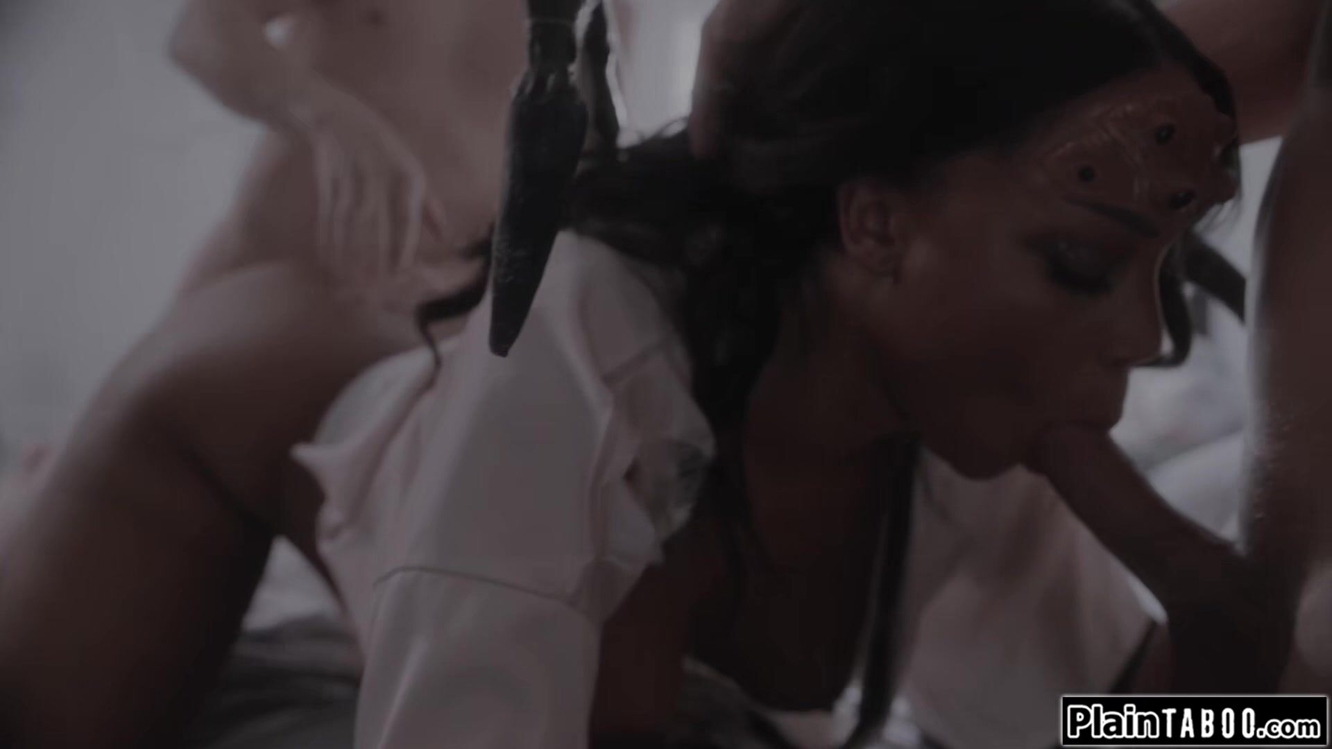 Husband comes home to his house full of cobwebs.Hes shocked when he sees his ebony wife August Skye turned into an arachnid and sucking her cocooned teen neighbor.He tries to make a deal to get them free and they agrees to fuck the busty milf spider