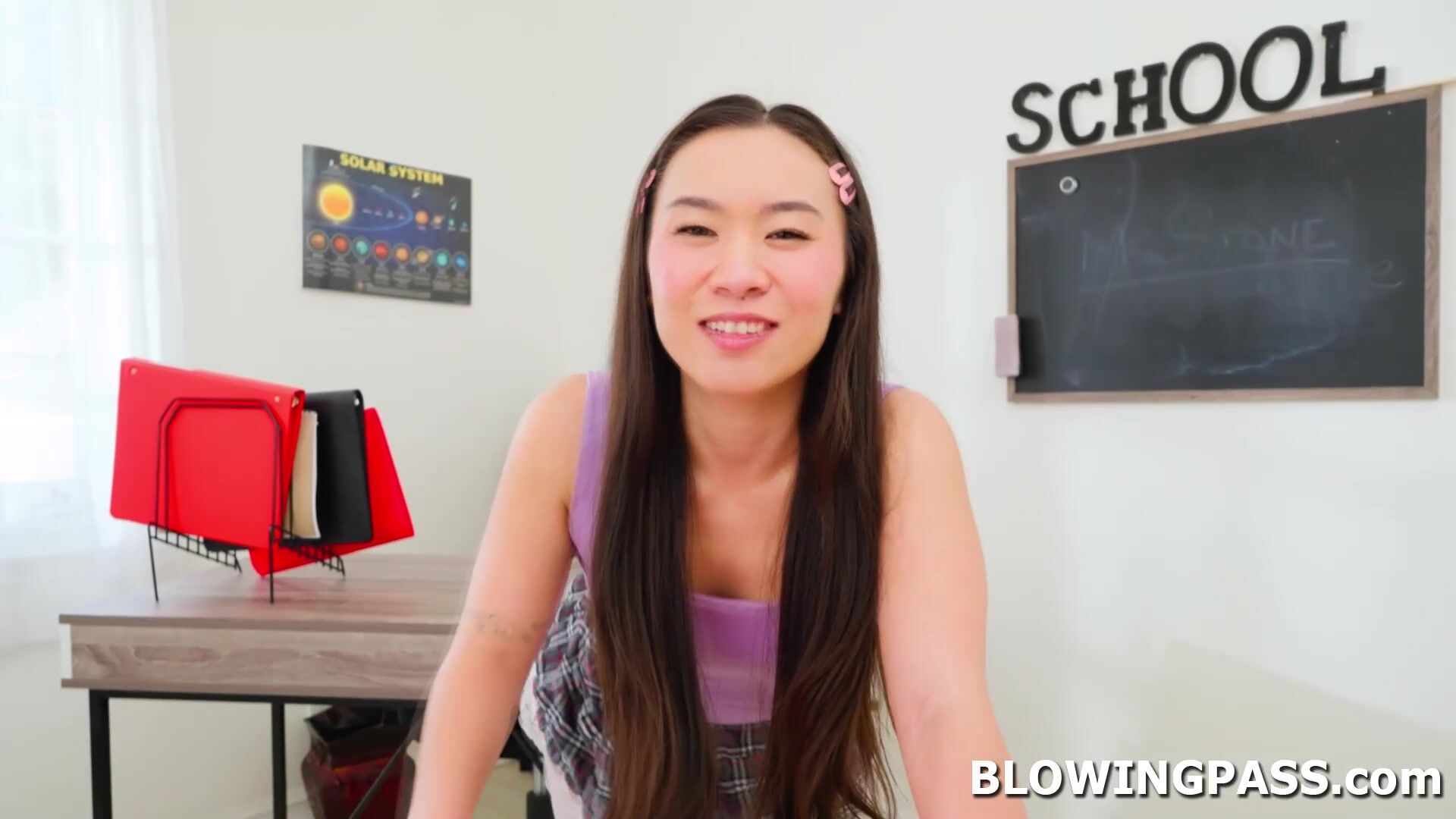 Kimmy Kimm gets bored in the detention room so she is teasing her classmate to do something crazy. The petite asian teen flashes her small tist and lets him grab them. The guy gets hard and so Kimmy starts sucking his big cock and sucking his balls.