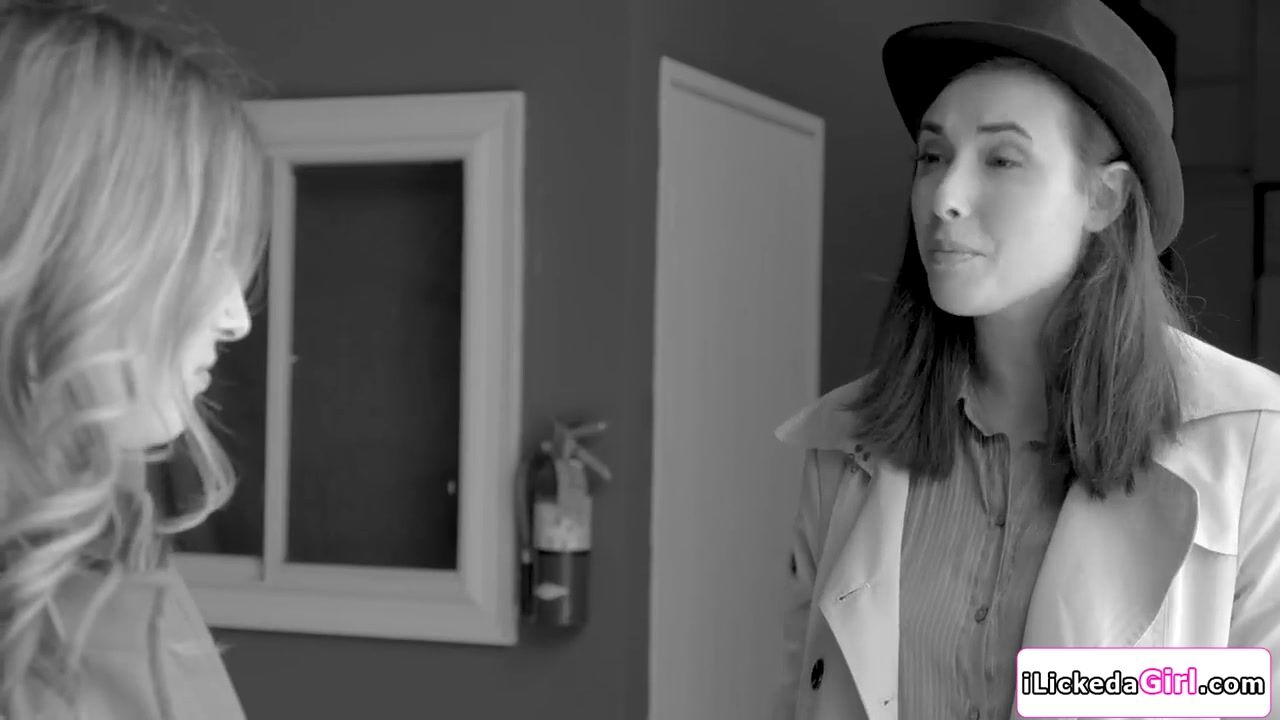 Detective Casey Calvert is willing to have sex with lesbian witness Kristen Scott for information.They kiss and suck each others small tits.Kristen removes her panties and licks her shaved pussy.Casey fingers her cunt while sucking her clit.
