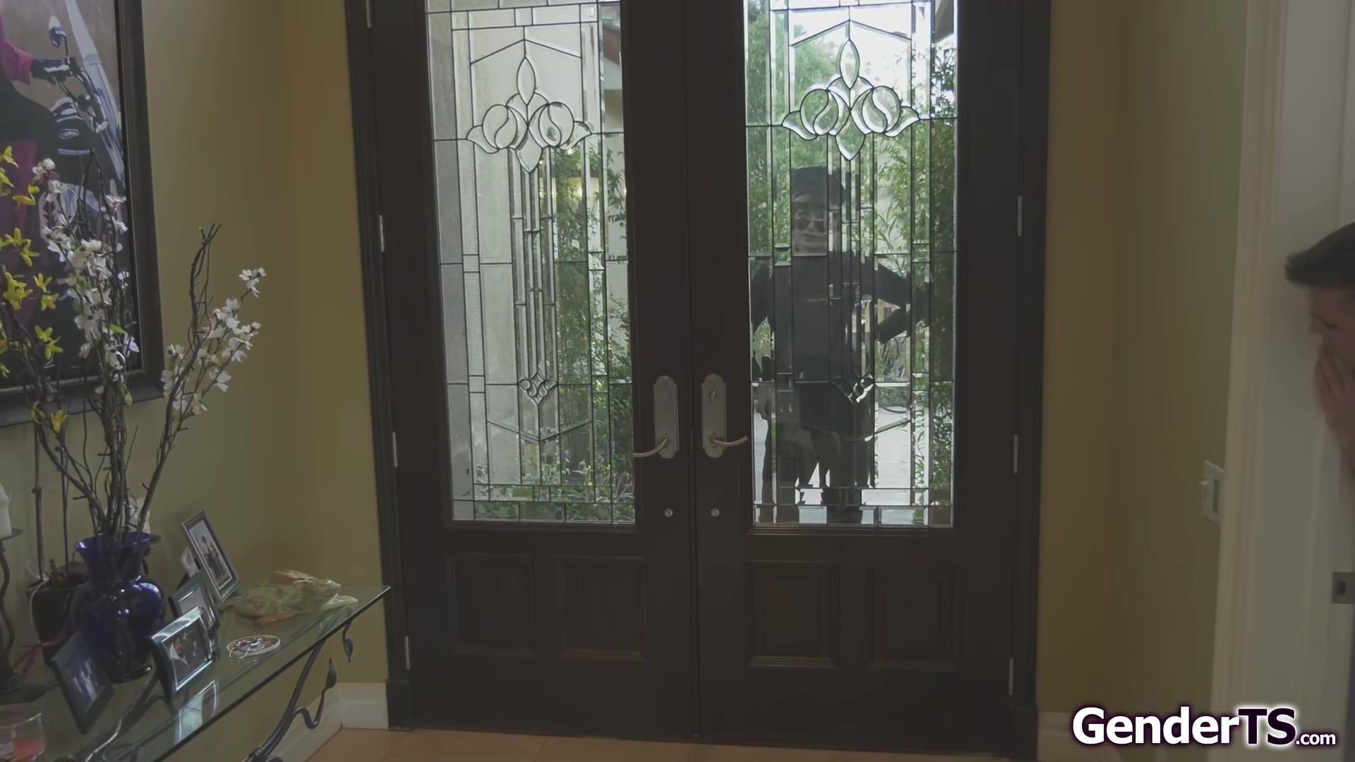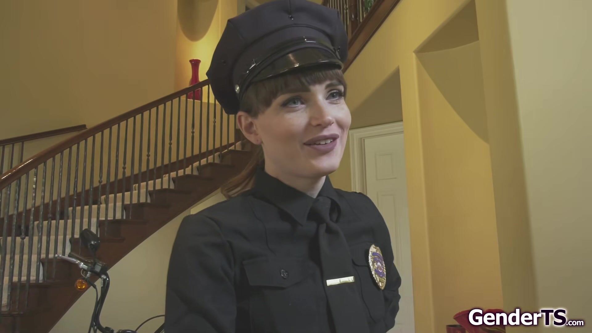 Shemale police officer Natalie Mars is here to the rescue.The tgirl calms down a guy but he notices her bulge and takes it out to deepthroat it.He grabs the small tits tranny by her ponytail while she sucks off his cock.The trans is anal barebacked