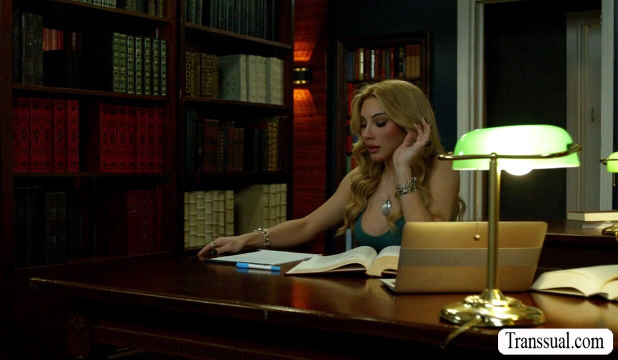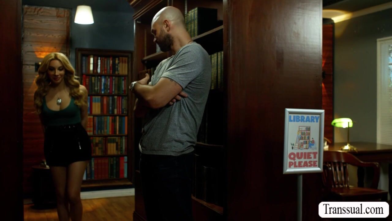 Big tits TS librarian meets this horny bald dude in the library and she gives him a passionate blowjob.After that,she lets him pound her tight butthole so deep and fucking hard.Go to Transsual.com for the full video of this.
