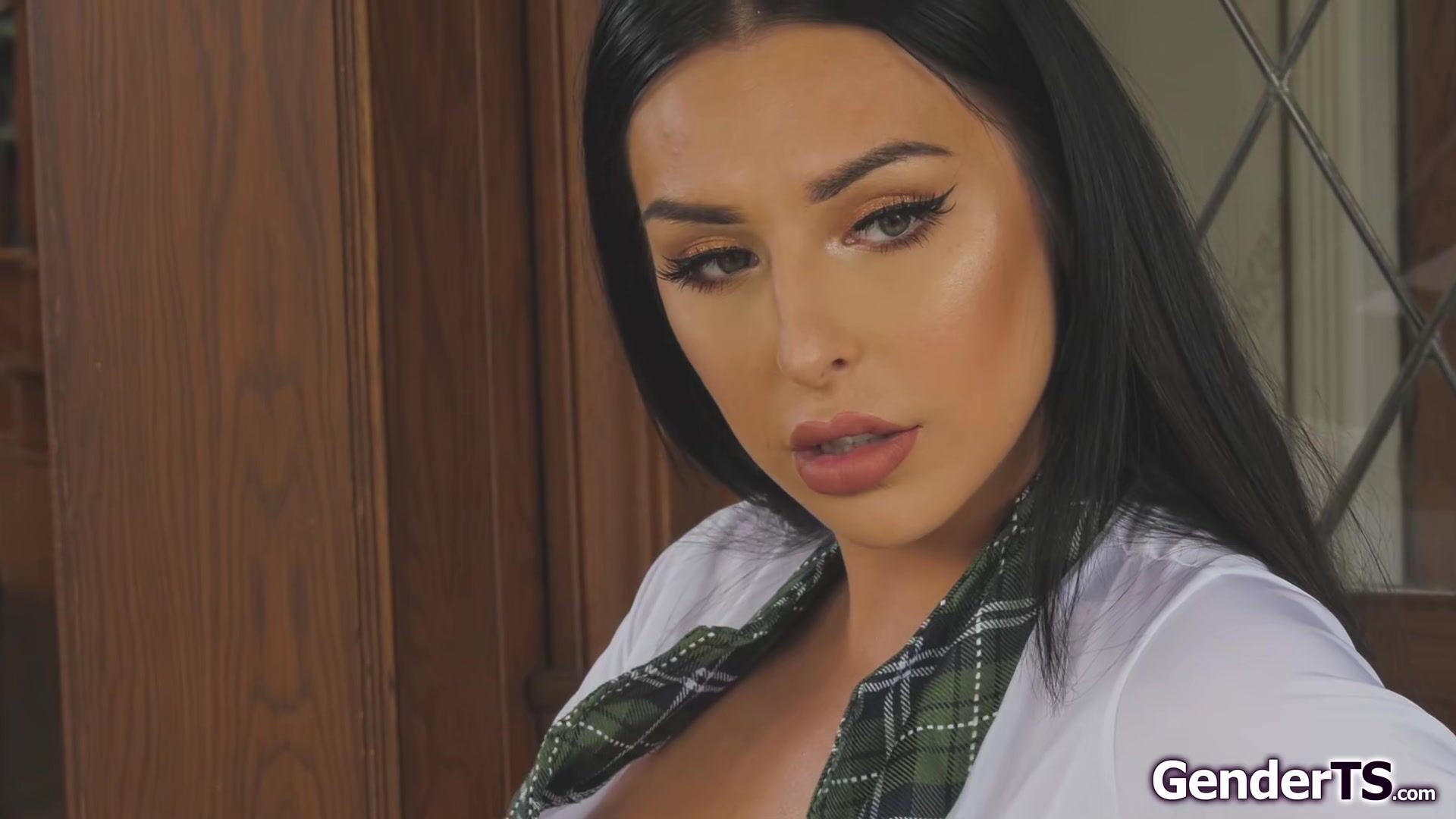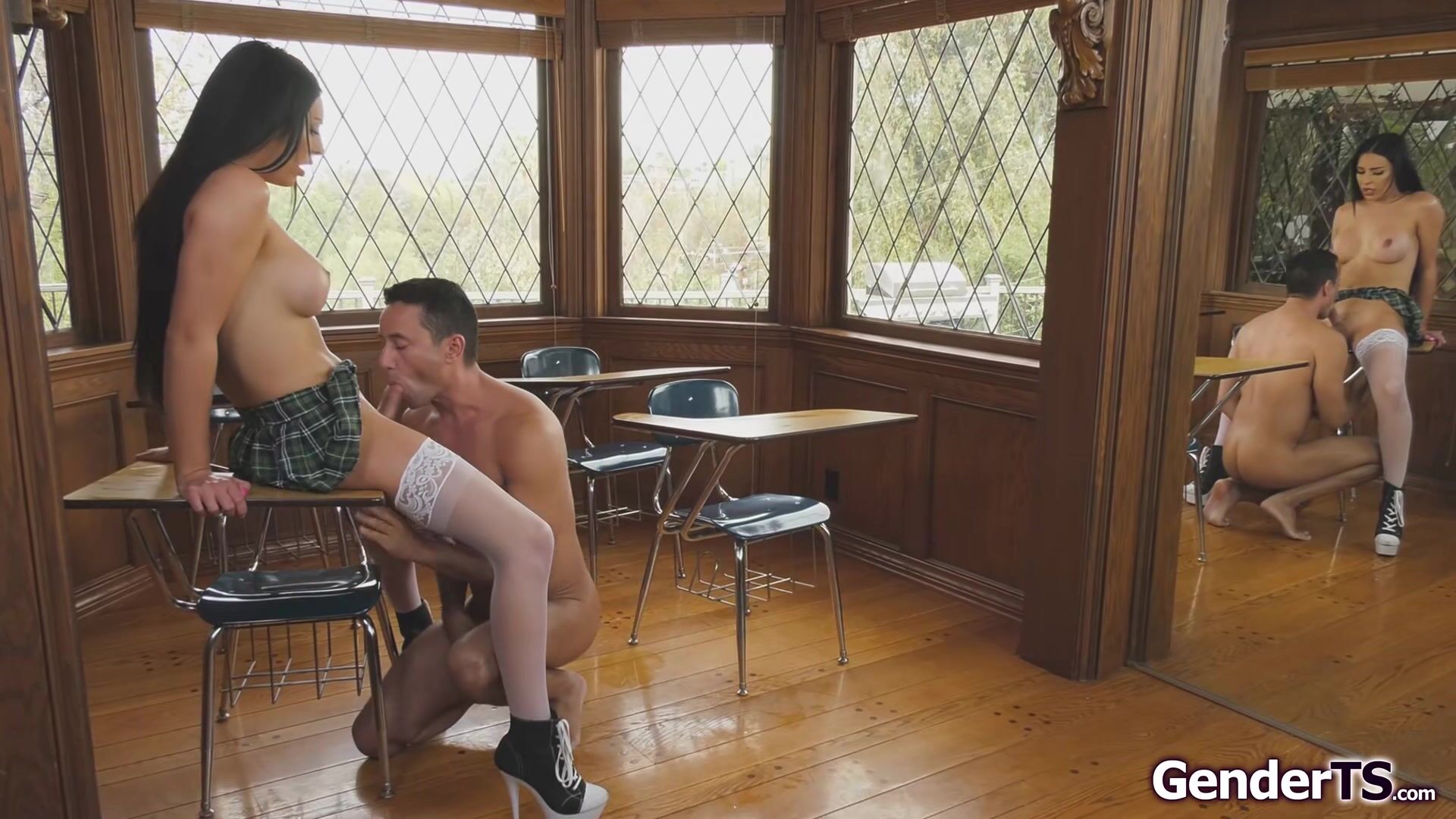 Tgirl Chanel Santini is taking her exam and gets horny with all the talks about bangCOCK.The busty shemale jerks off on her teacher and sucks his cock.The big tits trans is deepthroated and doggystyle bareback before she takes over and anal fucks him