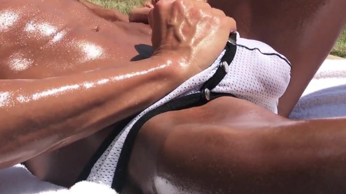 Masturbating in my back yard, trying to cum before my neighbors see me. It's hot, I'm oiled up and hard as a rock. Full vid shows me eating my own cum! Visit my profile for details.