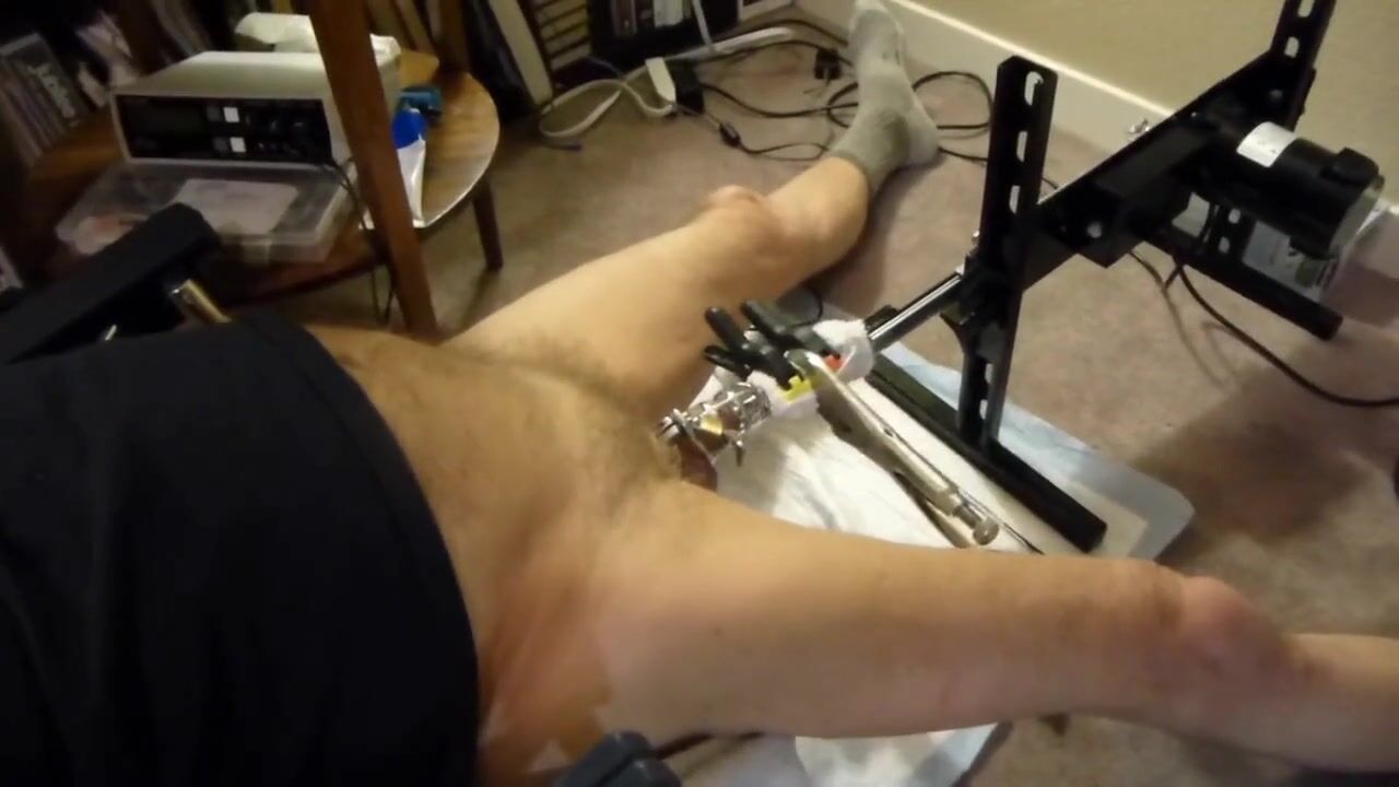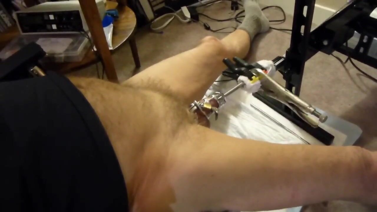 Wearing a chastity cage, the fuck machine sounds my cock with an 11mm sound (biggest that would go into the end of the chastity cage.