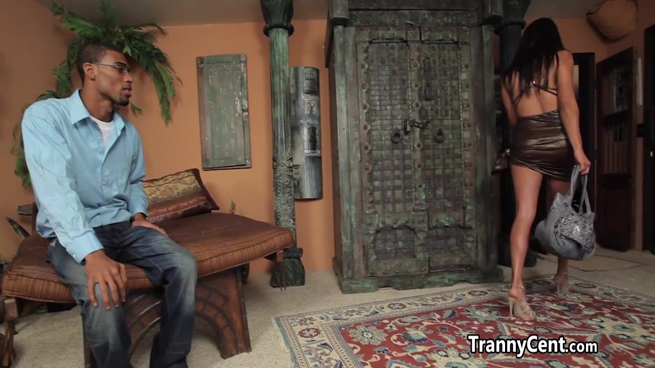 Sexy big boobied milf shemale in fishnet stockings enjoyed rimjob from black horny stud then she blowed his shaft and got her tranny big booty deep fucked until facial