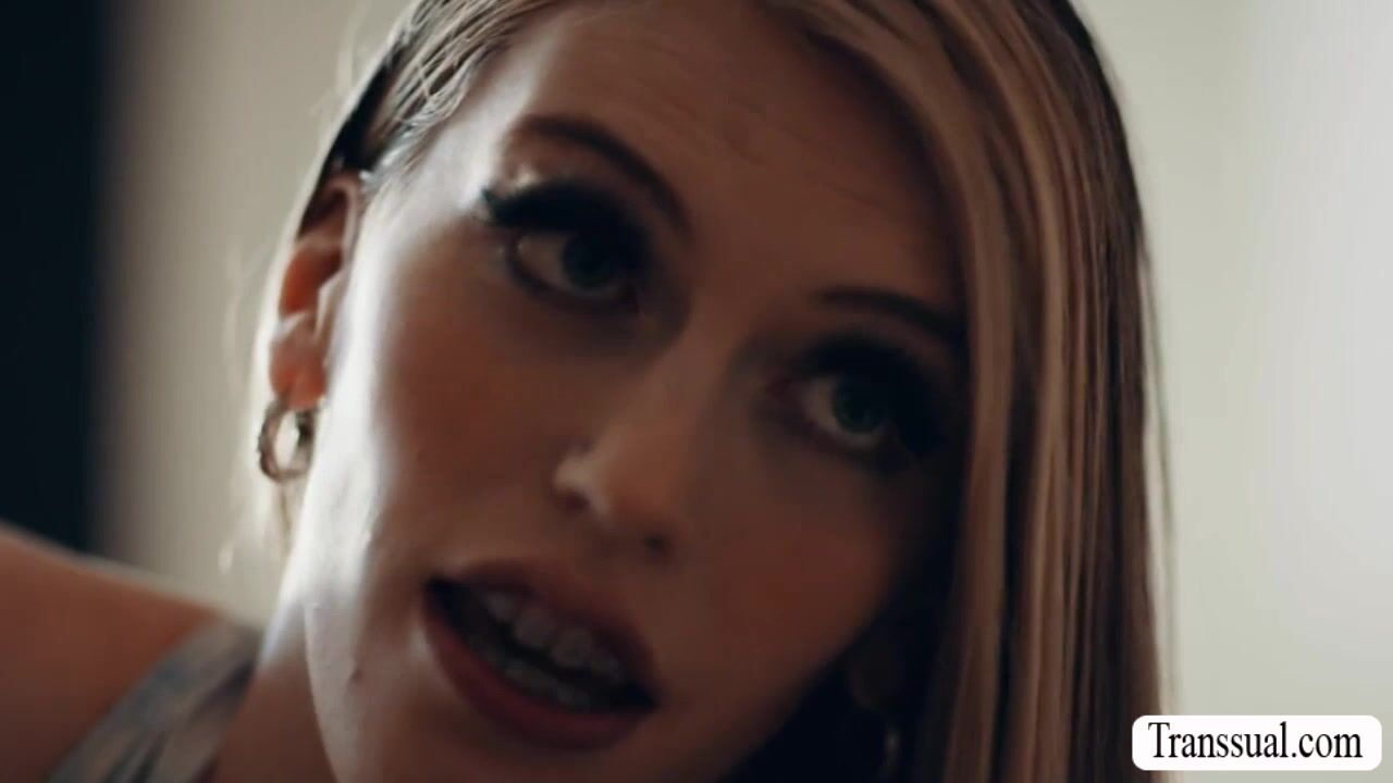 Blonde TS talks to her TS stepmom that her wife cheated on her.After that,they go on the bed and start kissing each other passionately.Next is,they pull out their shecocks and suck it before she lets her stepmom fuck her wet ass.