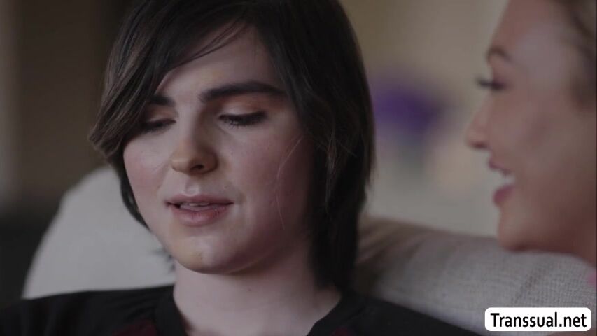 Brunette and pale petite tranny Ella Hollywood confess and fucks babe Adira Allures pussy on the couch.