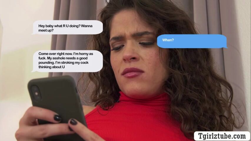 Curly babe caught her husband having affair with a trans woman.She texted her mistress and lets her come to their house.After that,they decide to have threesome sex and they start getting naked together.Next is,she lets her husband analed his mistress