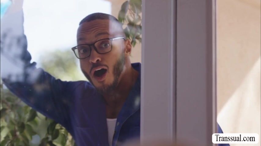 Two hot shemales get their asses bang by black window cleaner