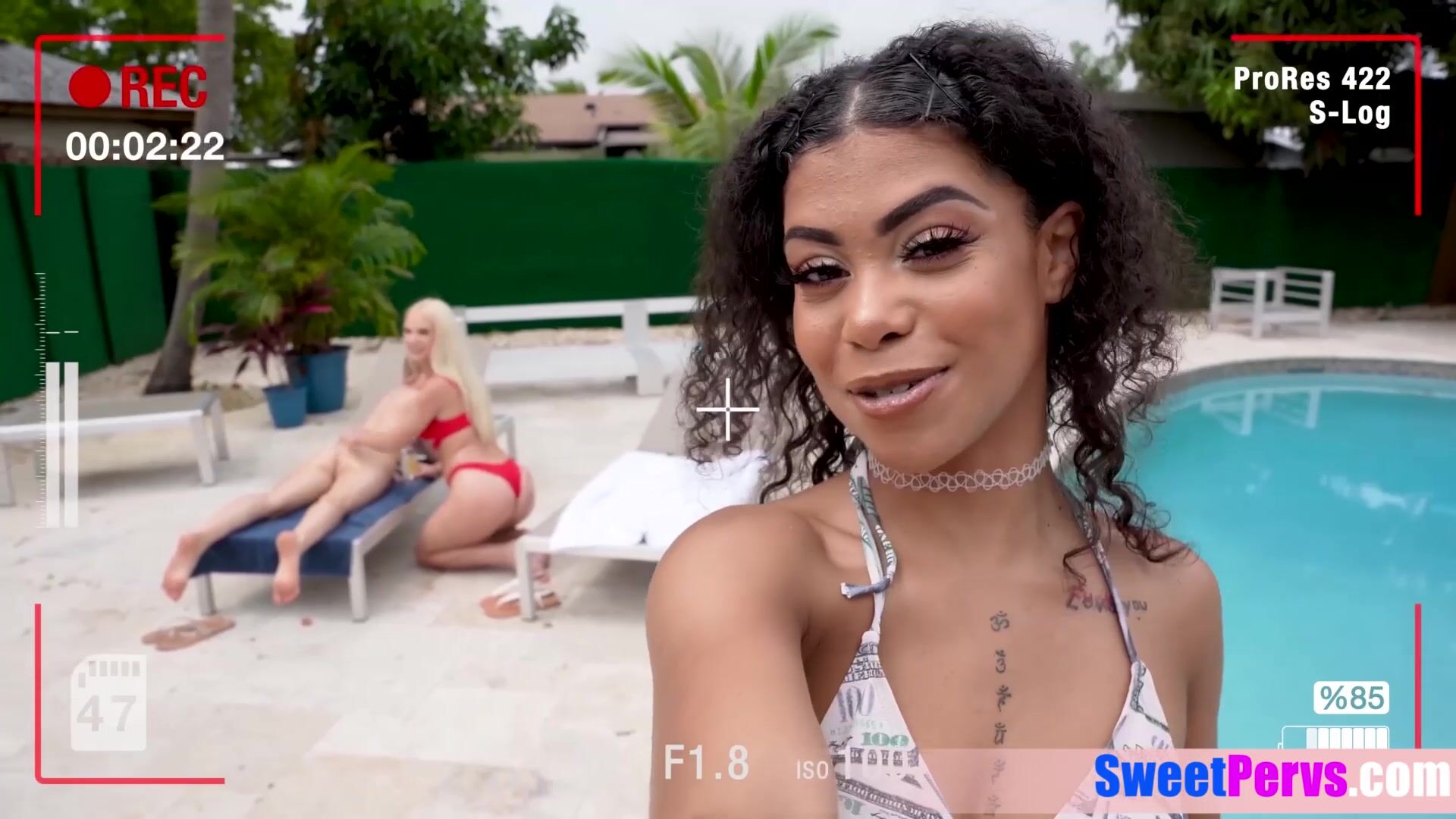 Ebony teen with small tits and her BFFS sneak into an abandoned house to use the pool but the landlord comes home so they using their pussies to get out of trouble They sucking his big dick then licking each other during he is fucking them